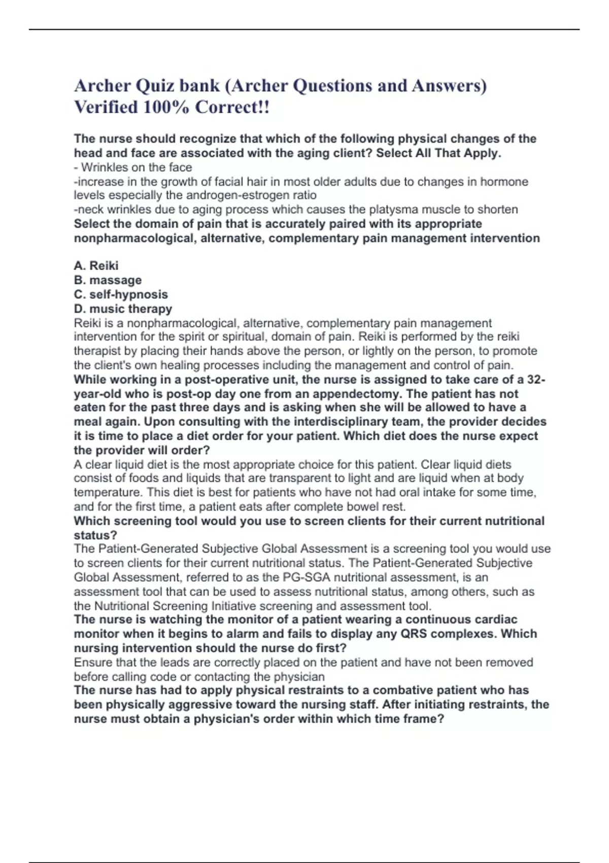 Archer Quiz bank (Archer Questions and Answers) Verified 100% Correct!! Archer Cat Rationales Questions And Answers Solved 100% Correct!! Archer Review Fundamentals NCLEX Quizzes & Ans Rated A+ Archer NCLEX Pharm Questions & Answers Solved 100% Correct!! Archer Nclex day 1 (Cardiovascular) Questions With 100% Correct Answers.