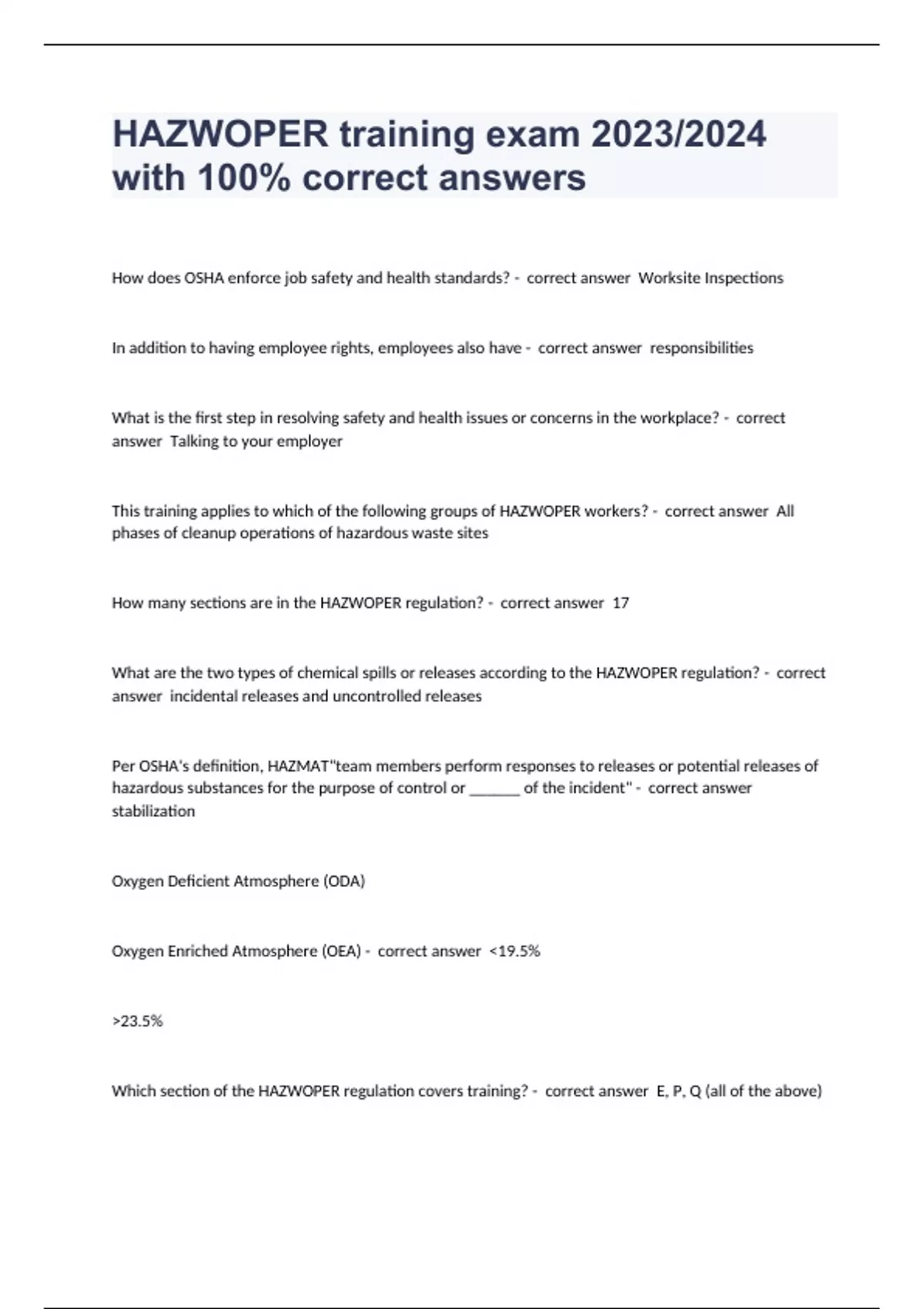 HAZWOPER Test 1 exam 2023/2024 with 100% correct answers Hazwoper Uscg exam 2023/2024 with 100% correct answers