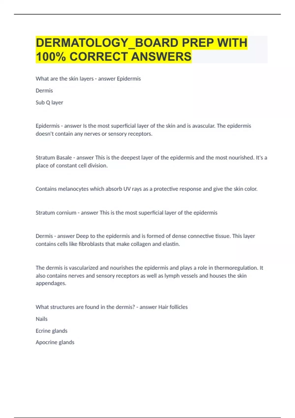 LAYERS OF THE SKIN DERMIS PRACTICE EXAM QUESTIONS AND ANSWERS.