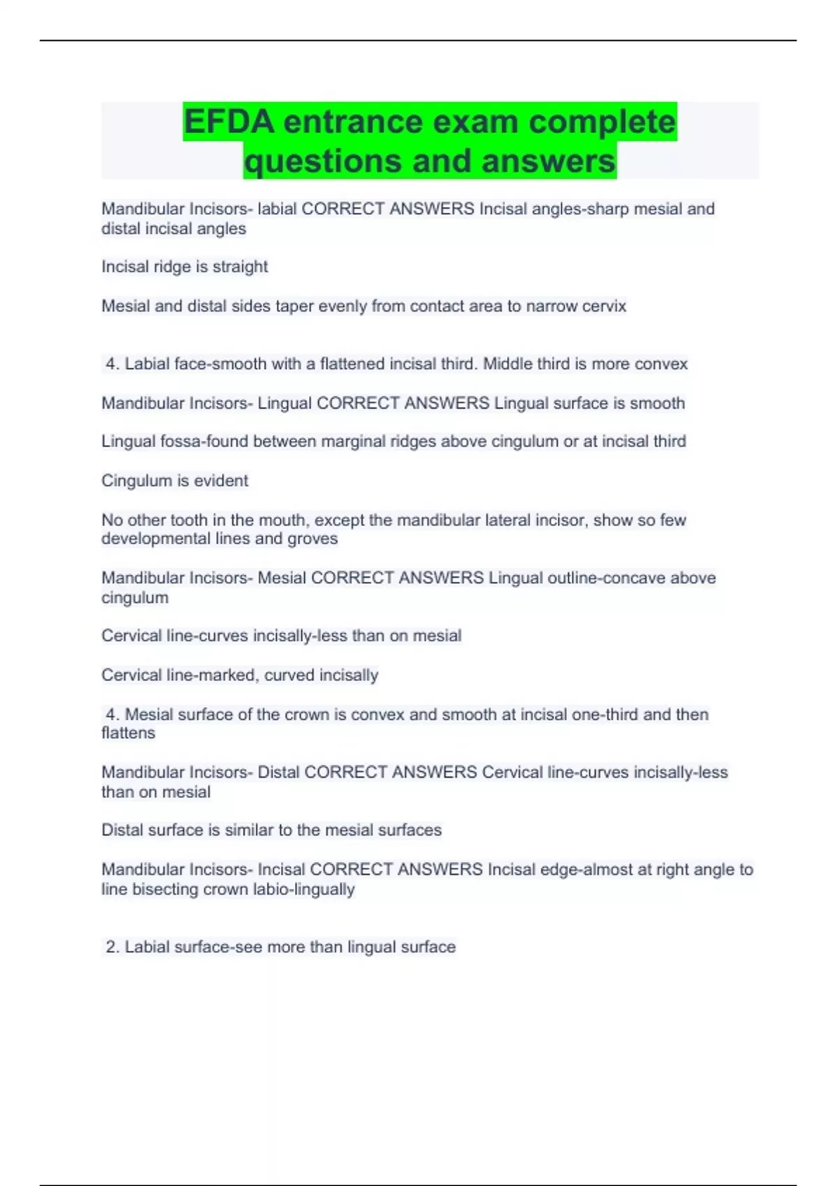 EFDA entrance exam complete questions and answers EFDA entrance exam questions and answers 100% correct EFDA Exam Review 100% Correct Answers |Verified EFDA review practice exam complete questions and solutions PA EFDA Board Exam Questions And Answers 100% Correct |Verified