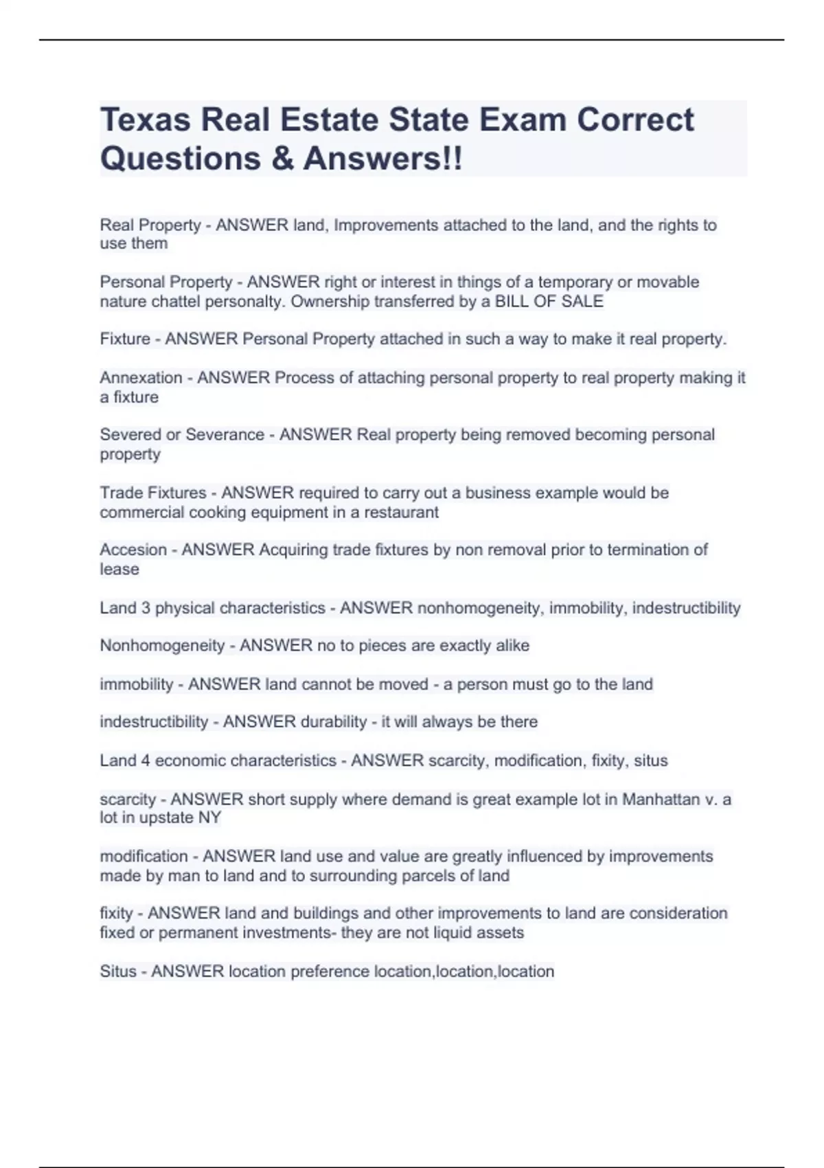 Texas Real Estate Exam (State)Correct Questions & Solutions(Rated A+)(COMPLETE SOLUTIONS PACK!!!)EXAM BUNDLE