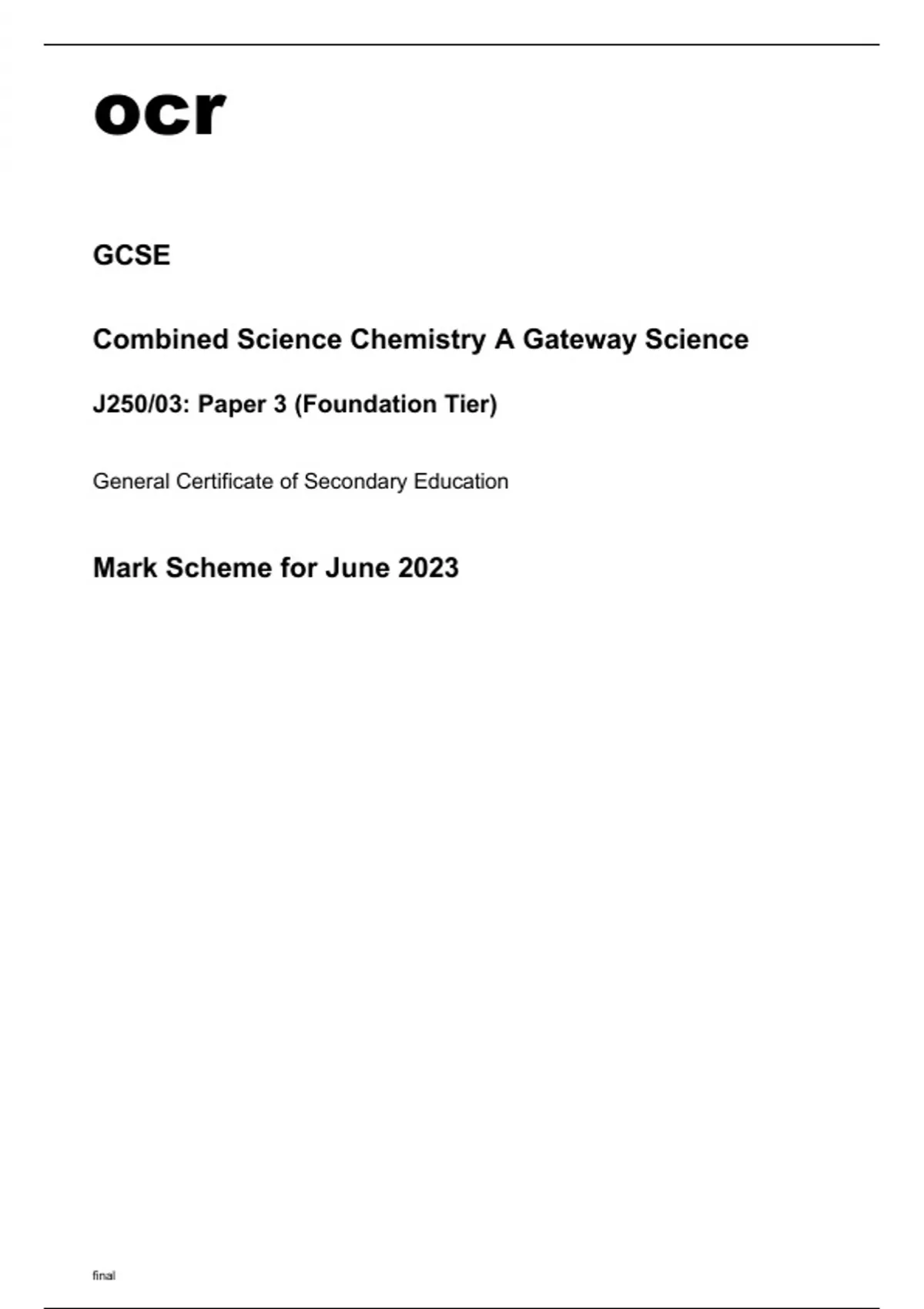 ocr GCSE Combined Science Chemistry A Gateway Science J250/03 Mark Scheme and Question Paper June2023. ocr GCSE Combined Science Chemistry A (Gateway Science) J250/03 Question Paper May2023. ocr GCSE Combined Science Chemistry A Gateway Science J250/03 Mark Scheme June2023. J250/03 qp and ms