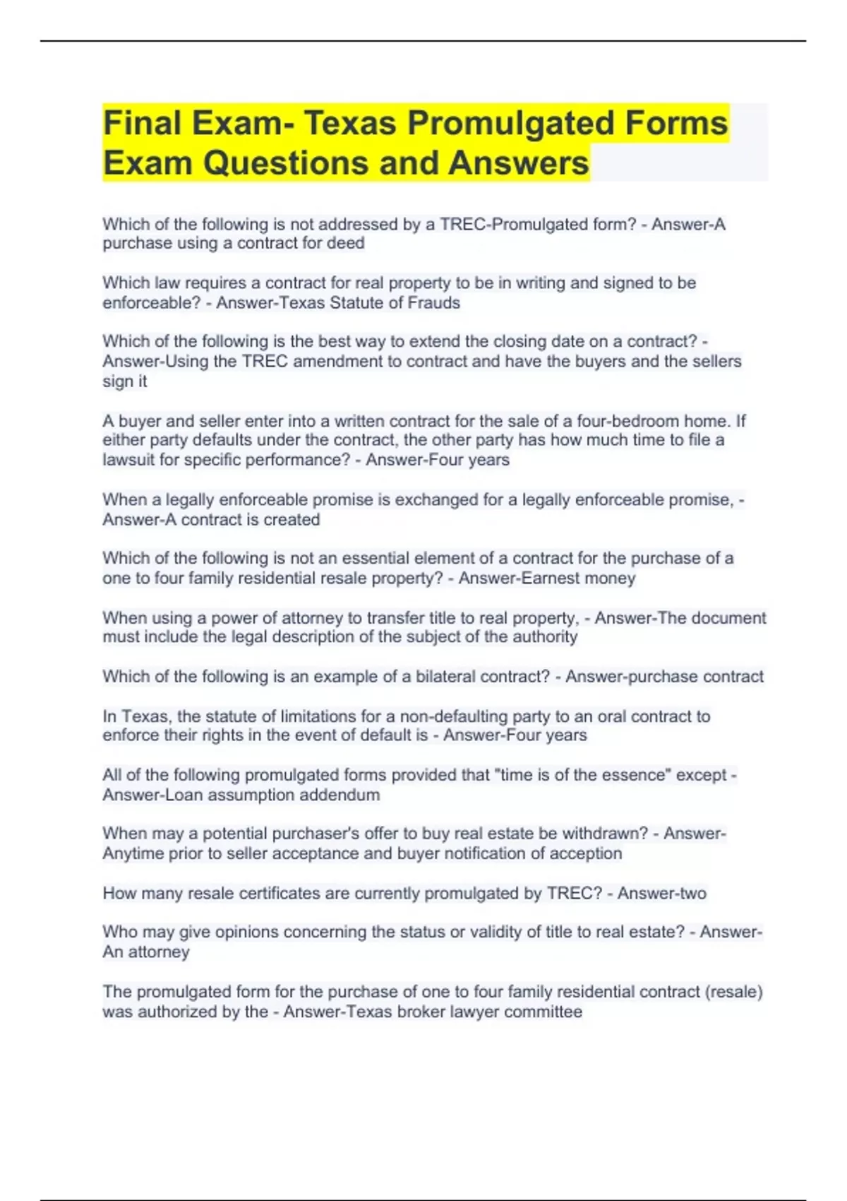 exas Promulgated Forms Exam Questions with Correct Answers 2 Exam (elaborations) Texas Promulgated Forms Exam Questions with Complete Verified Answers 2023 3 Exam (elaborations) Texas Promulgated Forms Exam Questions with Complete Solutions Latest update (Pass Guaranteed) 4 Exam (elaborations) Texas Promulgated Forms Exam questions with complete