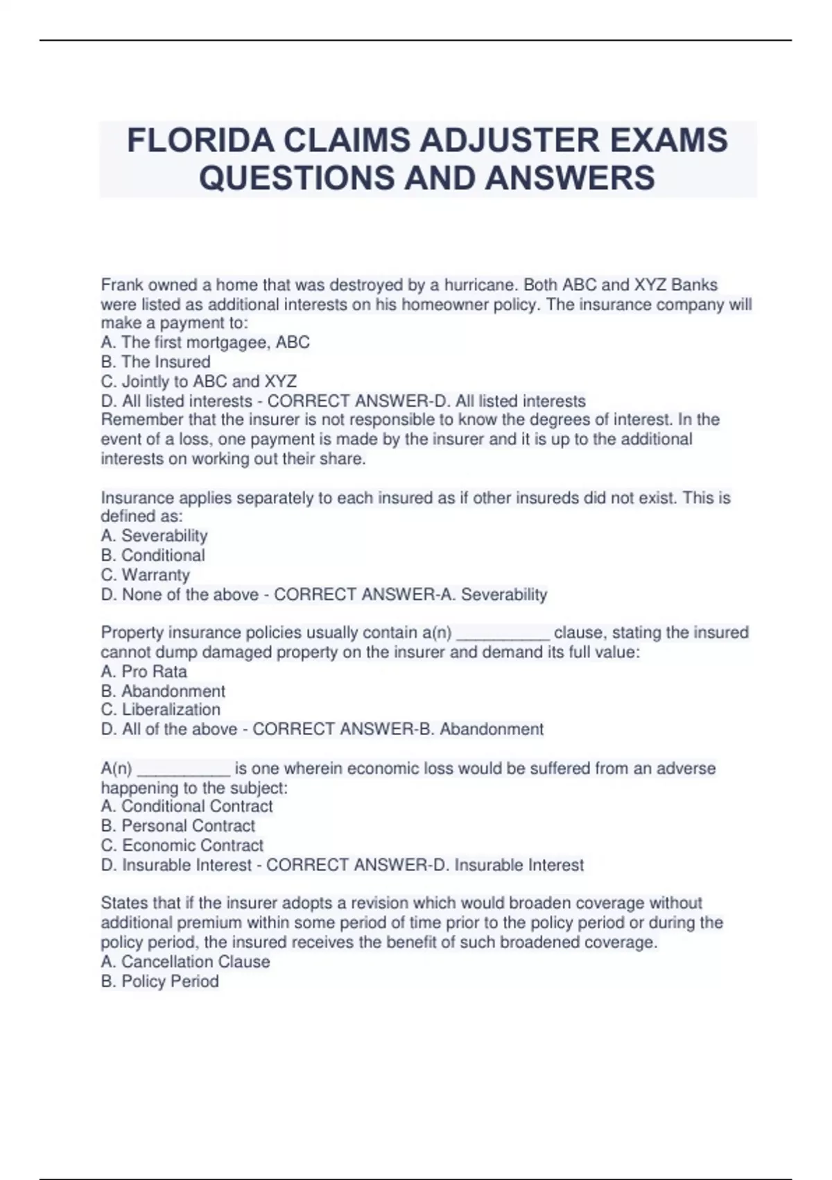 FLORIDA CLAIM ADJUSTER STUDY TEST 2023/2024 FLORIDA CLAIM ADJUSTERS PRACTICE QUESTIONS AND ANSWERS FLORIDA 3-20 CLAIM ADJUSTERS STUDY QUESTIONS AND ANSWERS FLORIDA CLAIMS ADJUSTER EXAM QUIZ WITH CORRECT ANSWERS 6-20 FLORIDA CLAIMS ADJUSTER REVIEWED QUESTION AND ANSWER FLORIDA ALL LINES CLAIMS ADJUSTER EXAM TEST REVIEWS FLORIDA 6-20 ALL LINES ADJUST