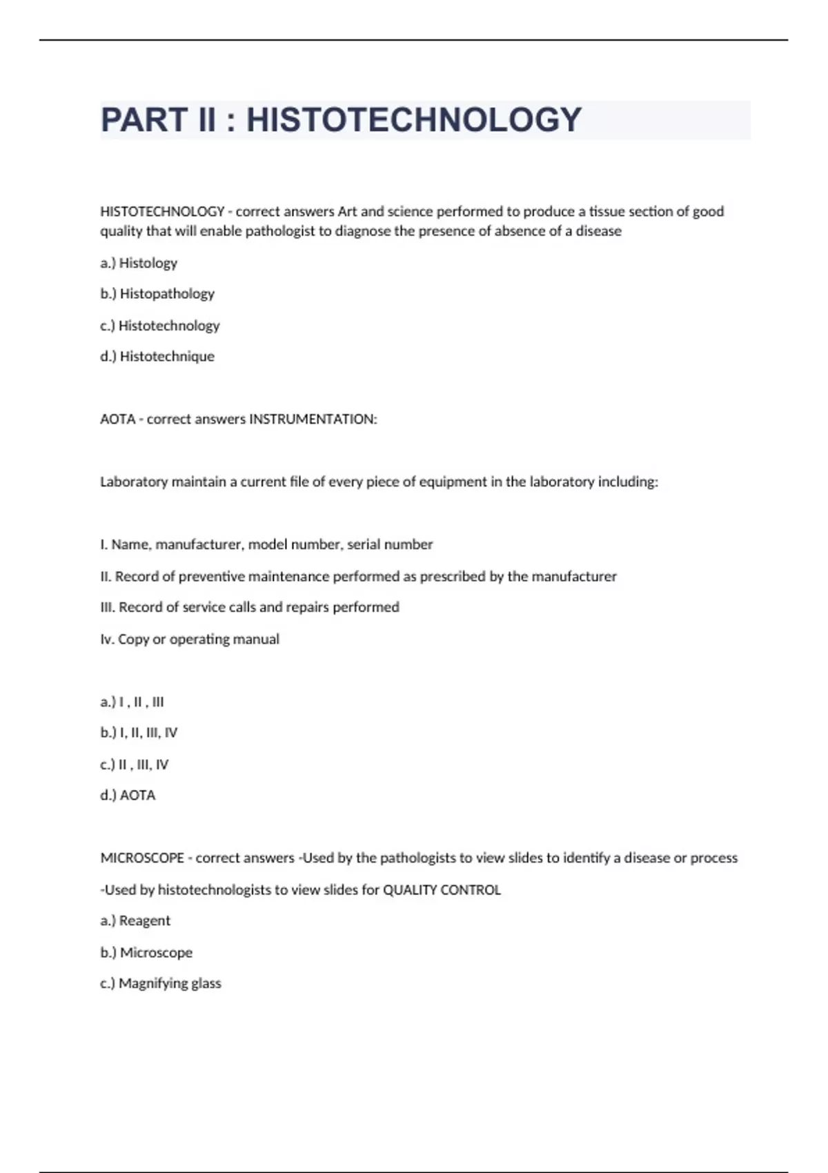 1 Exam (elaborations) ASCP Histotechnology Practice Test verified to pass 2023/2024 2 Exam (elaborations) ASCP Practice Questions - Histotechnology 2023/2024 already passed 3 Exam (elaborations) BOC Histotechnology- Processing correctly answered graded A+ 2023/2024 latest update 4 Exam (elaborations) BOC Study Guide Histotechnology 2nd ed.- Fixa