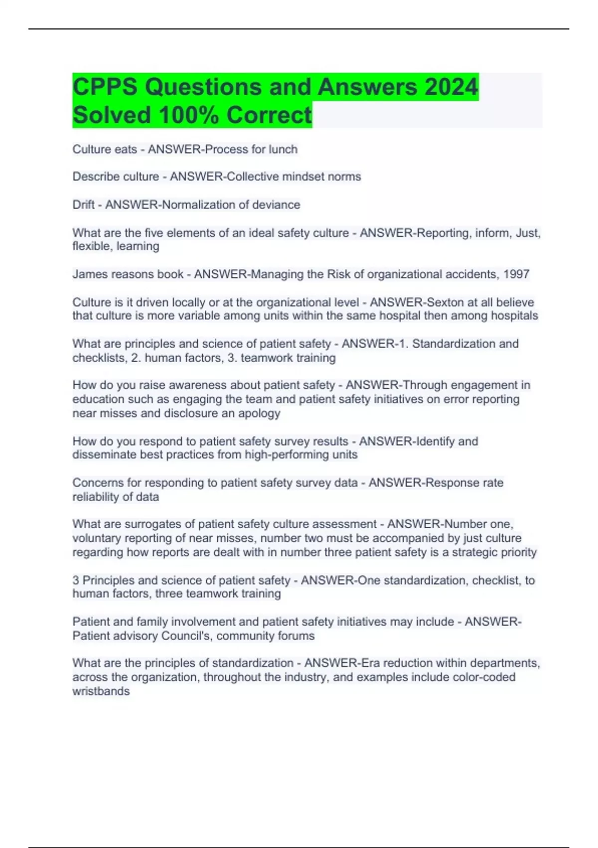 1 Exam (elaborations) CPPS Questions and Answers 2024 Solved 100% Correct 2 Exam (elaborations) CPPS Review Course Exam 2023/2024 Graded A+ 3 Exam (elaborations) CPPS Exam 2024 with Complete Solutions 4 Exam (elaborations) Certified Professional In-Patient Safety Exam 2024 Answered 100% Correct 5 Exam (elaborations) CPPS Terms Blue Sheet Solved