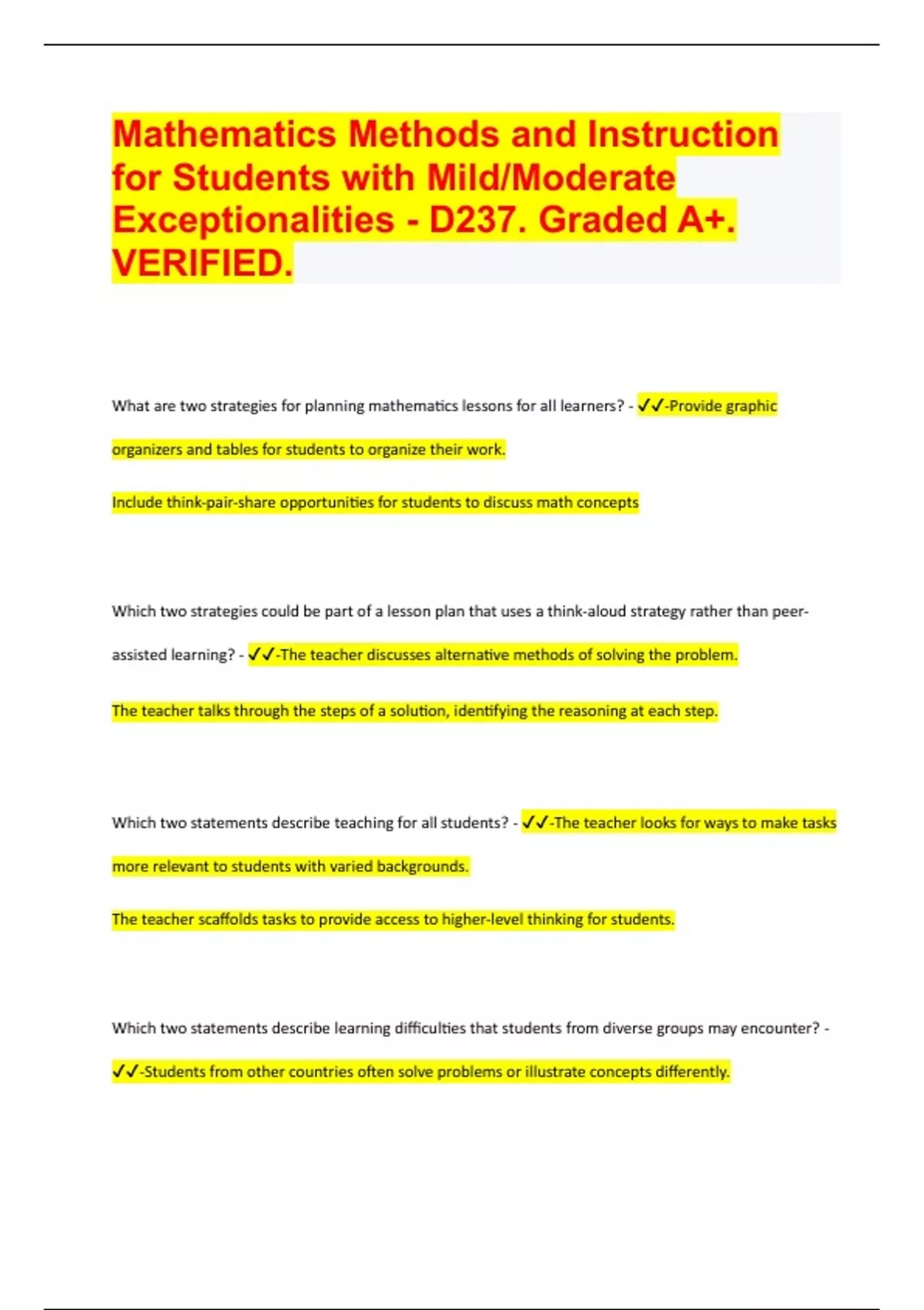 (Top QUALITY 2024/2025 EXAM REVIEW) Mathematics Methods and Instruction for Students with Mild/Moderate Exceptionalities - D237. Graded A+. VERIFIED.