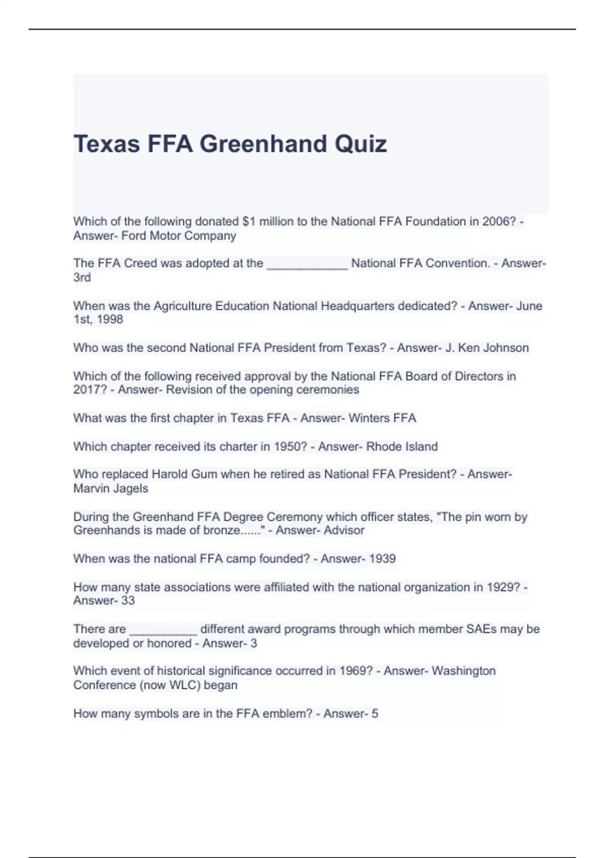 FFA Greenhand Quiz-Answered
