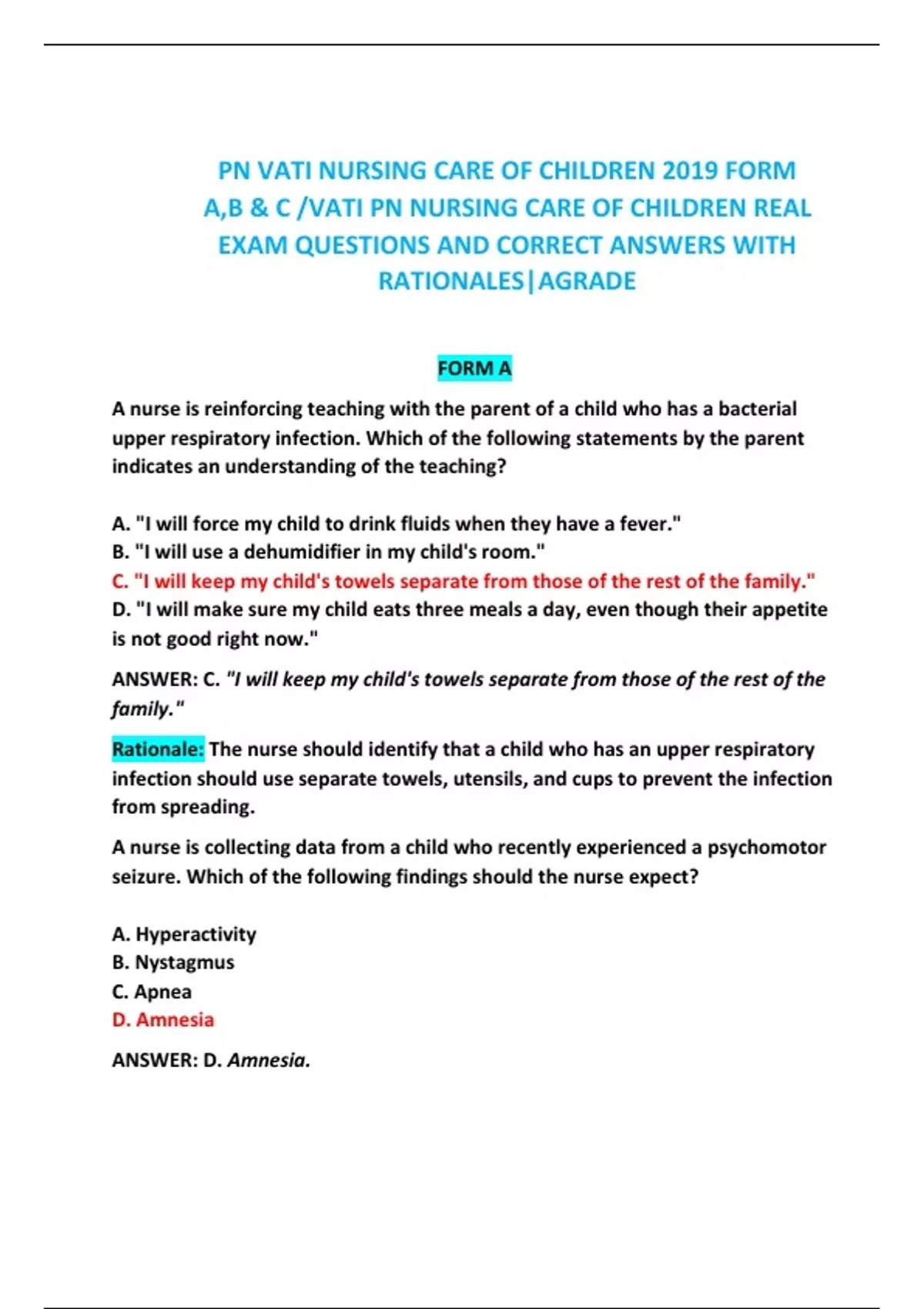 PN VATI NURSING CARE OF CHILDREN 2019 FORM A,B & C /VATI PN NURSING CARE OF CHILDREN REAL EXAM QUESTIONS AND CORRECT ANSWERS WITH RATIONALES|AGRADE