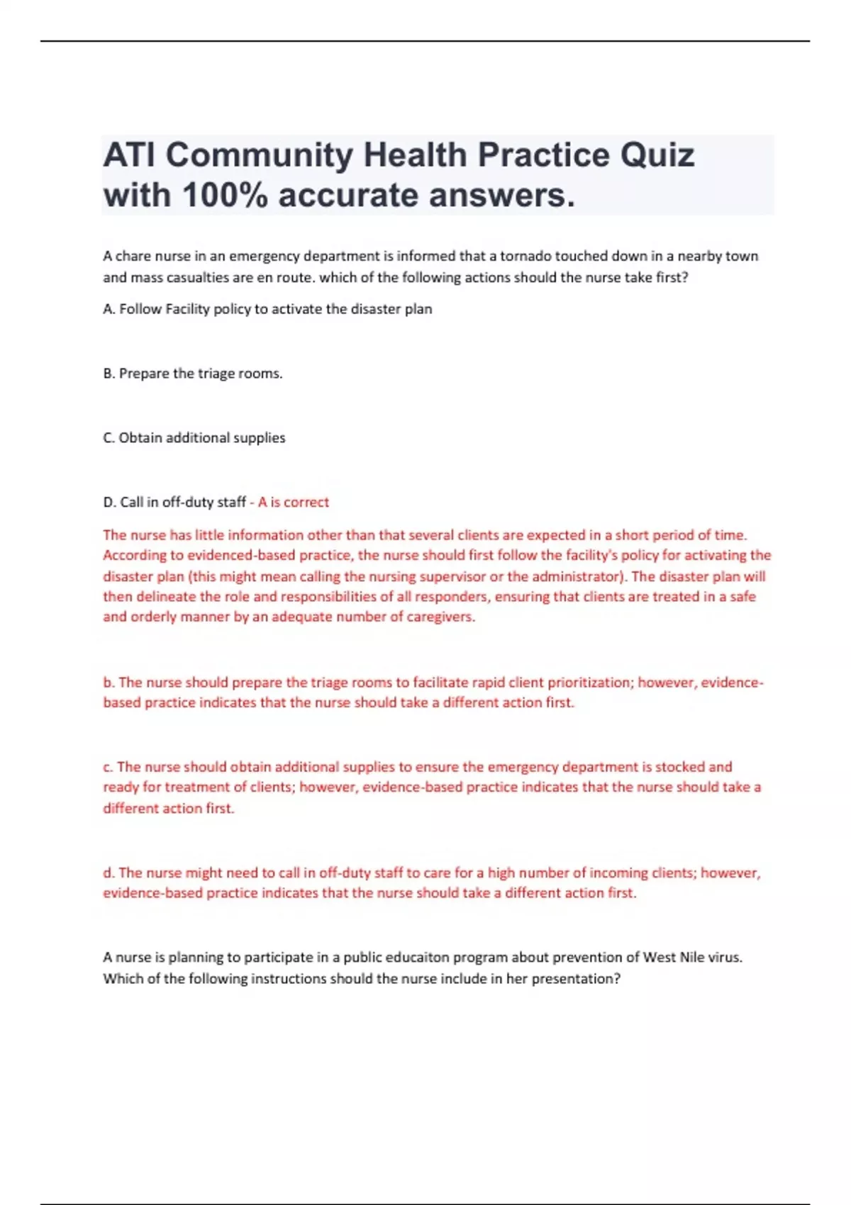 ATI Community Health Practice Quiz with 100% accurate answers. ATI Community Health Nursing Proctored Focus. Rated A ATI Community Health Practice A. Questions and answers. Rated A masterpiece. ATI Community Health Practice A, Questions and 100% correct answers. A compiled ATI Community Health B exam review questions and answe