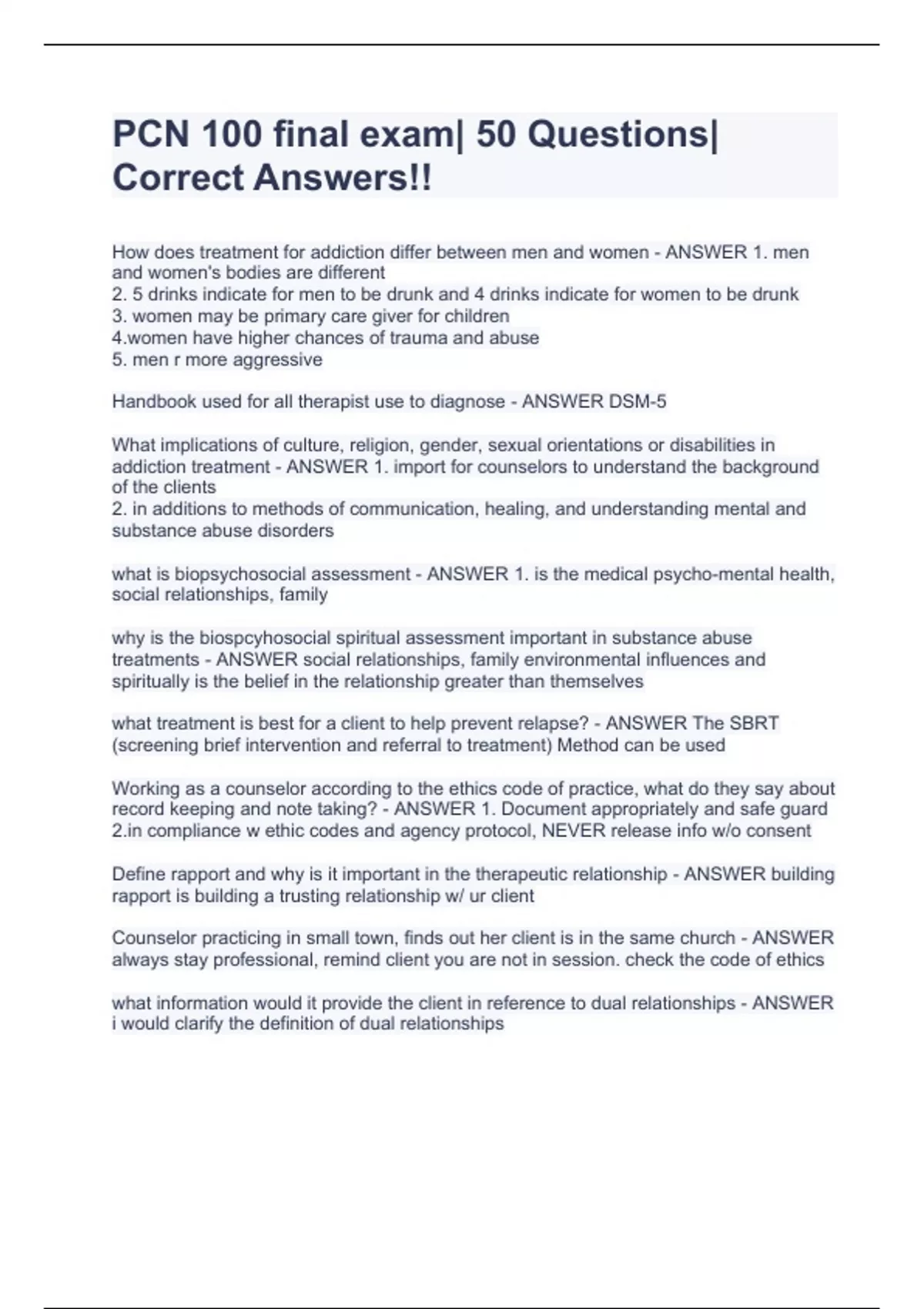 Final Exam Study Guide - Foundations of Substance Abuse (PCN- 100)Correct 100%