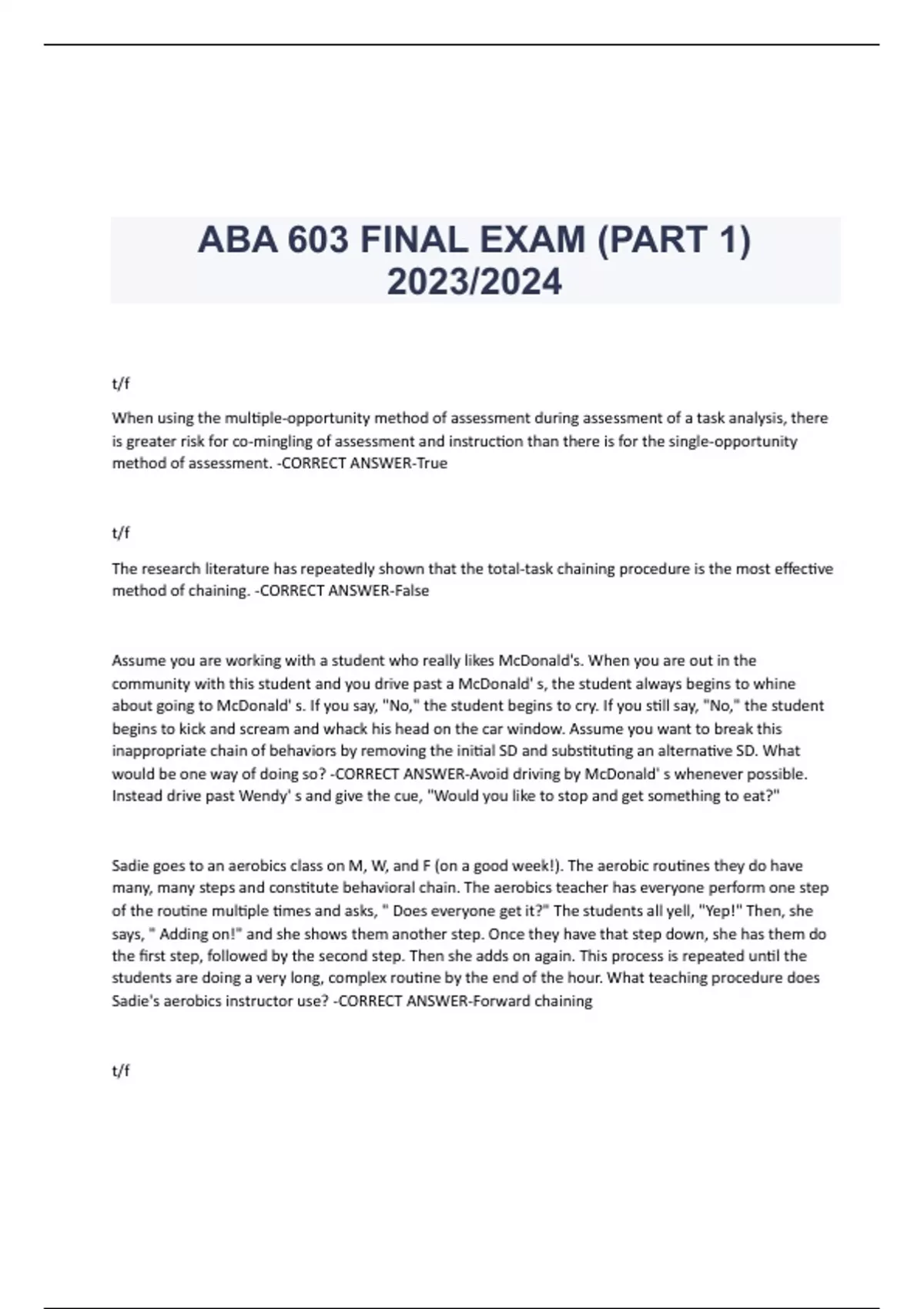 ABA 603 CH 20 UPGRADED EXAM WITH 100% CORRECT ANSWERS 2023/2024 COMPLETE EXAM FOR ABA (603) CHAPTER 21 LATEST EDITION 2023/2024 ABA (603) CHAPTER 23 EXAM (QUESTIONS AND ANSWERS) 2023/2024 ABA 603 FINAL REVIEWED EXAM WITH CORRECT ANSWERS 2023/2024 ABA 603 UPDATED EXAM TEST WITH COMPLETE SOLUTIONS 2023/2024 ABA 603 FINAL EXAM (PART 1) 2023/2024