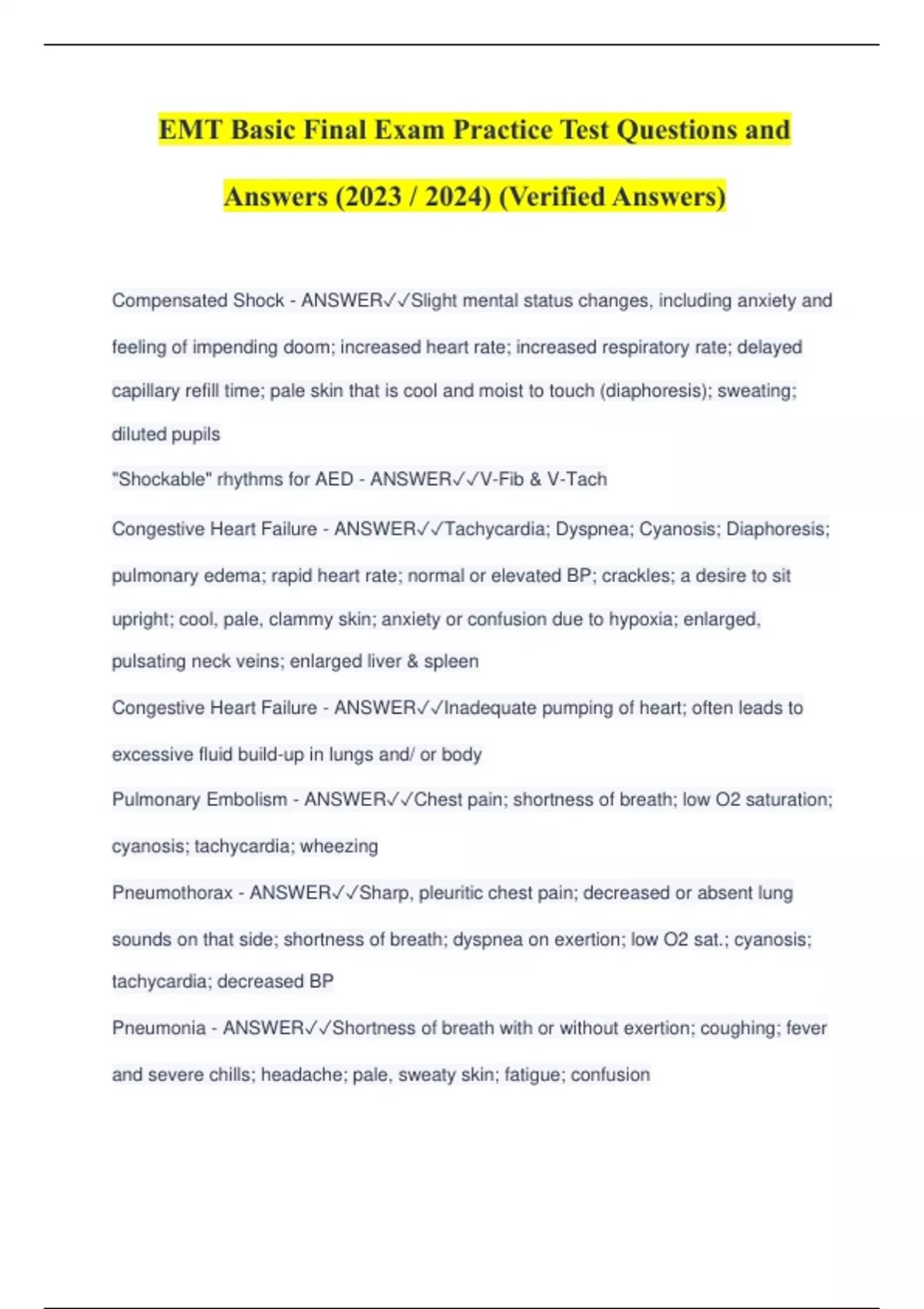 EMT Basic Final Exam Practice Test Questions and Answers (2023 / 2024) (Verified Answers)