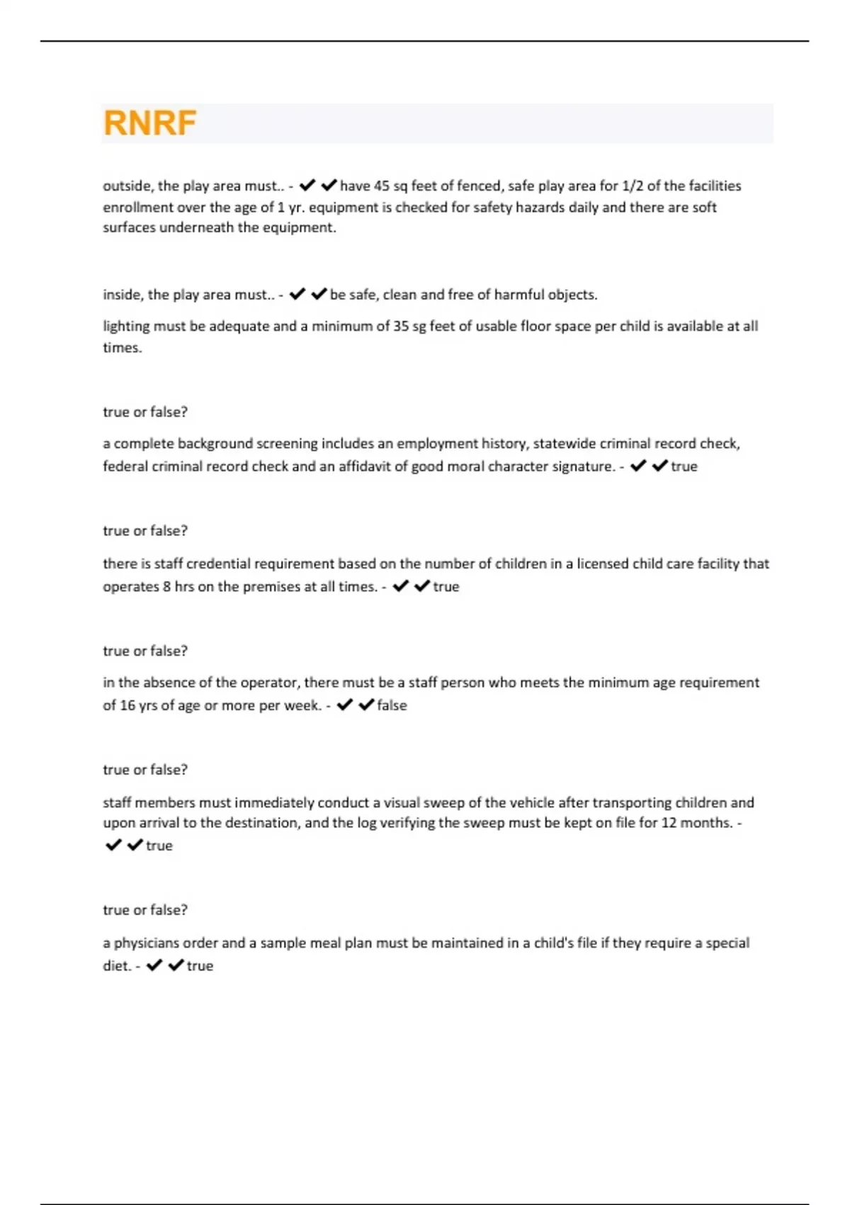 Child Care Facility Rules and Regulations (RNRF) Questions & Answers Solved 100% Correct!!