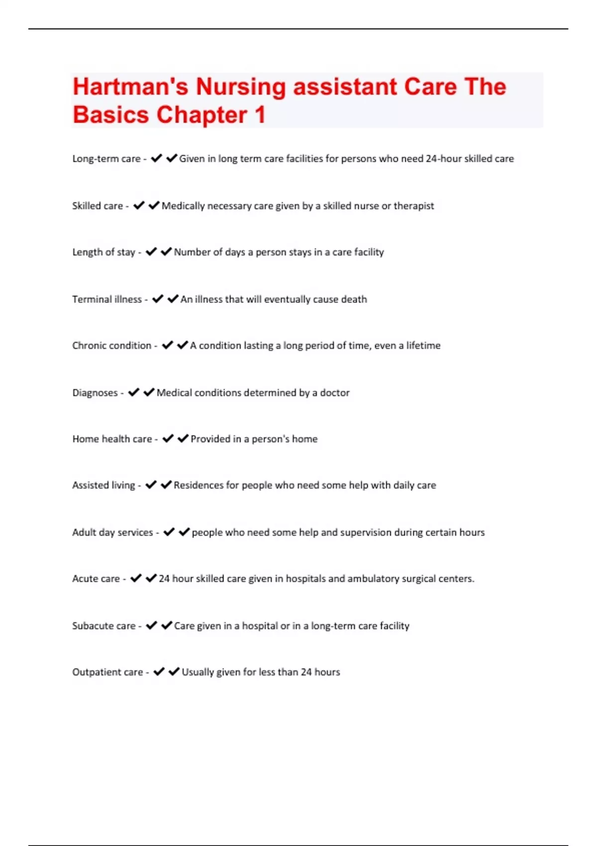 Hartman's Nursing assistant Care The Basics Chapter 1 Exam Questions And Answers Already Graded A+