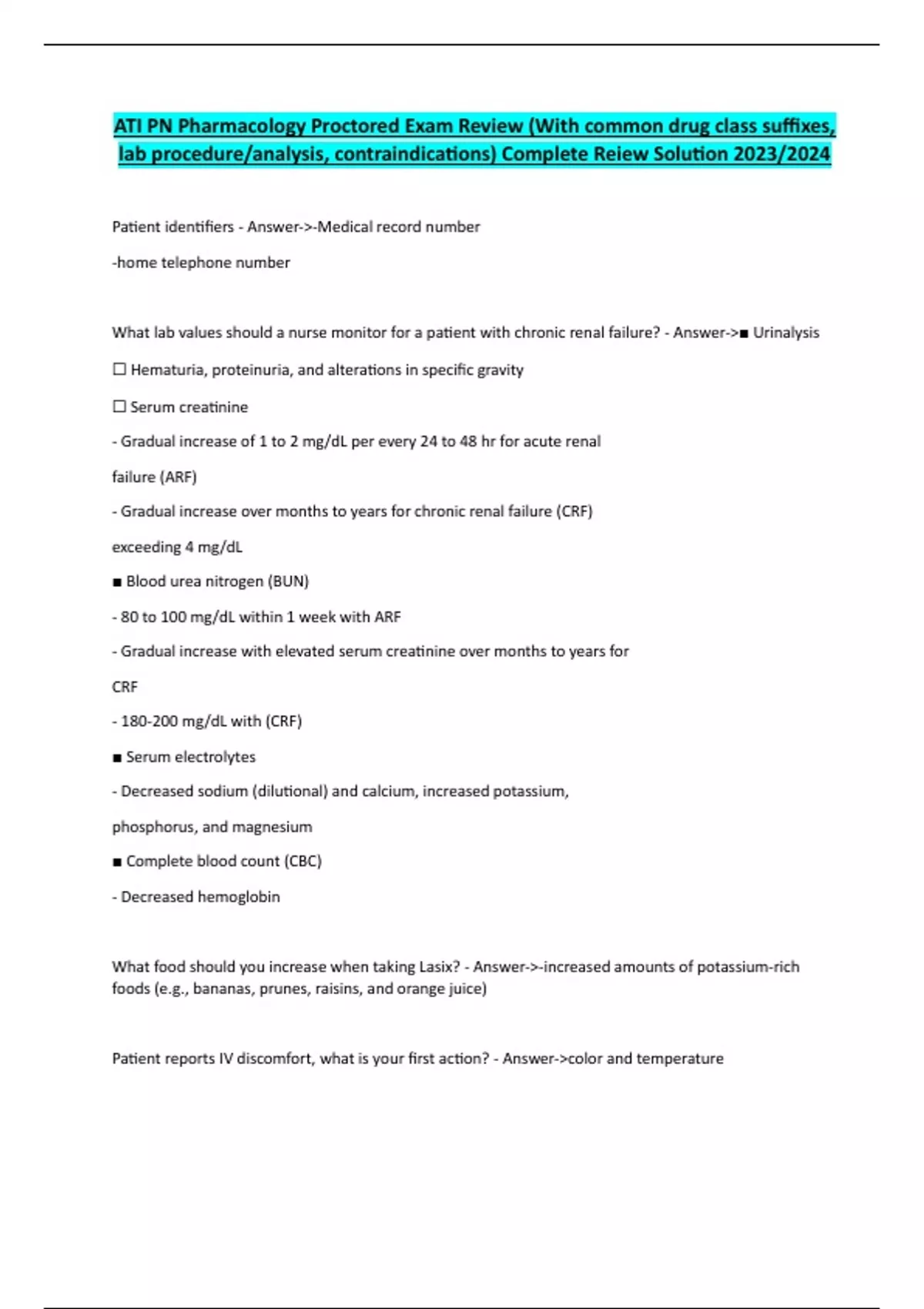 ATI PN Pharmacology Proctored Exam Review (With common drug class suffixes, lab procedure/analysis, contraindications) Complete Reiew Solution 2023/2024, ATI Pharm Proctored Exam LPN Questions & Answers A+, ATI Pharmacology Proctored Exam Study
