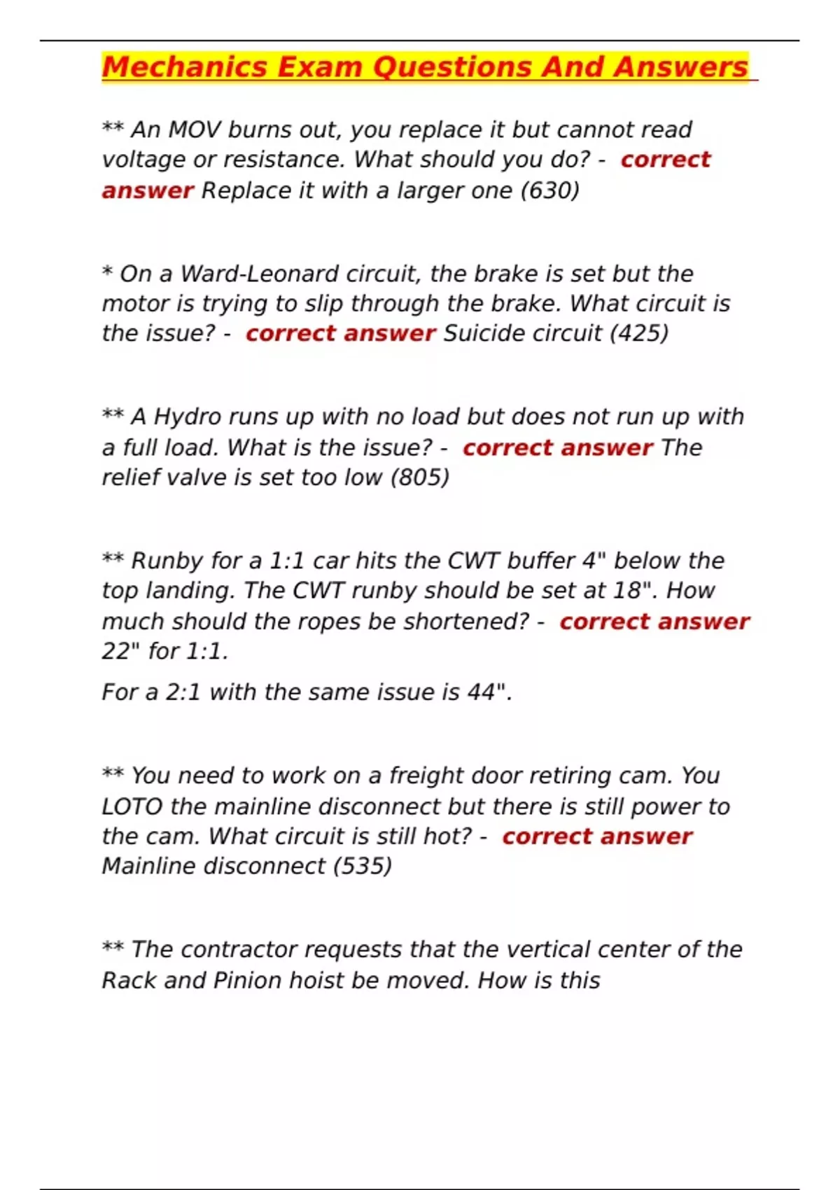 Ma State Elevator Exam Grade A+ ,C.A State Elevator Mechanic ,C.A State Elevator Mechanic ,100 elevator final exam,NEIEP 800 final review Questions With Complete Solutions