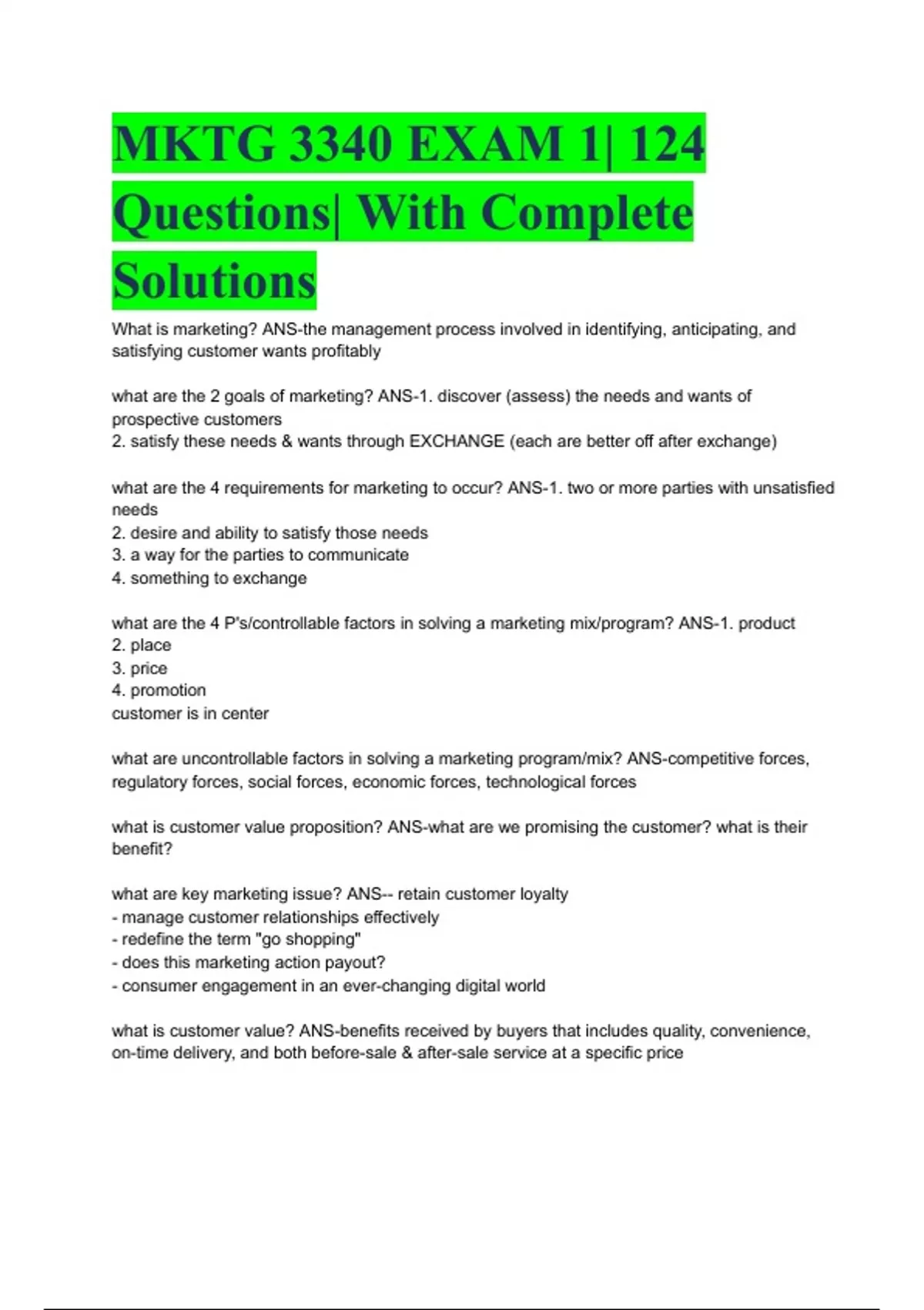 MKTG 3340 Exam 1 (1,2,3,5,8) Questions With Complete Solutions/MKTG 3340 Quiz 1 Questions And Answers/MKTG 3340 Midterm Questions| With Complete Solutions/Marketing 3340 Exam 1 (Summer) Questions With Complete Solutions