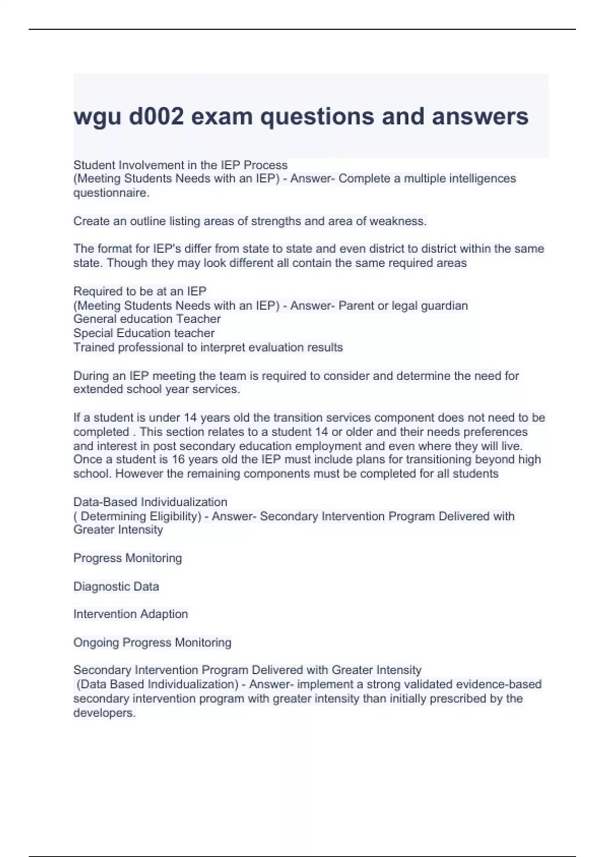 1 Exam (elaborations) wgu d002 exam questions and answers 100% correct 2 Exam (elaborations) WGU D002 Exam Questions and Answers Graded A 3 Exam (elaborations) WGU D002 Case Laws Exam Questions and Answers 4 Exam (elaborations) WGU D002 - Professional, Ethical, and Legal Practices for Special Ed Exam Graded A 5 Exam (elaborations) Ultimate WGU
