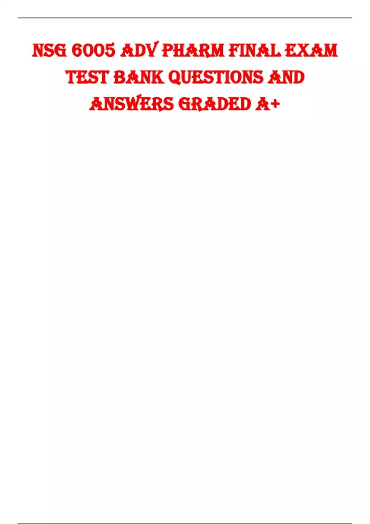 NSG 6005 Adv Pharm FINAL EXAM TEST BANK QUESTIONS AND ANSWERS GRADED A+/NSG 6440 PREDICTOR TEST 2023 COMPLETE QUESTIONS AND ANSWERS ALREADY PASSED WITH A+/NSG 6420 MIDTERM HELP 2023 QUESTIONS AND ANSWERS 100% CORRECT GRADED A+/NSG 6420 MIDTERM 2023 QUESTIONS AND ANSWERS GRADED A+ 100% CORRECT