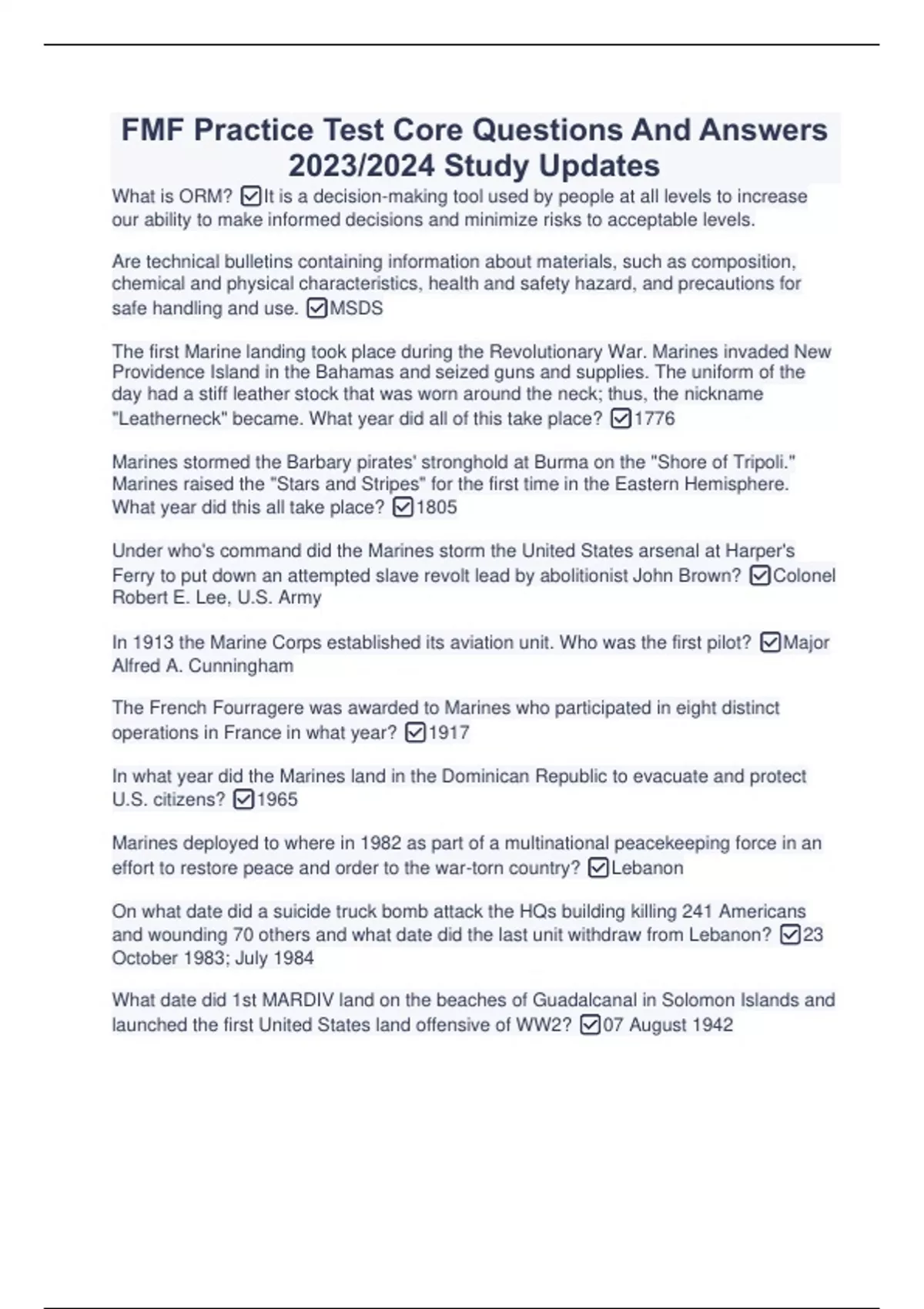 Fleet Marine Force FMF Verified Package Deal Solutions With Complete Updates 2023/2024 FMF CORE TEST E Verified Questions And Answers With Complete Updates FMF Practice Test Core Questions And Answers 2023/2024 Study Updates FMF Practice Test (By HMC V) Questions And Answers 2023/2024 Quiz