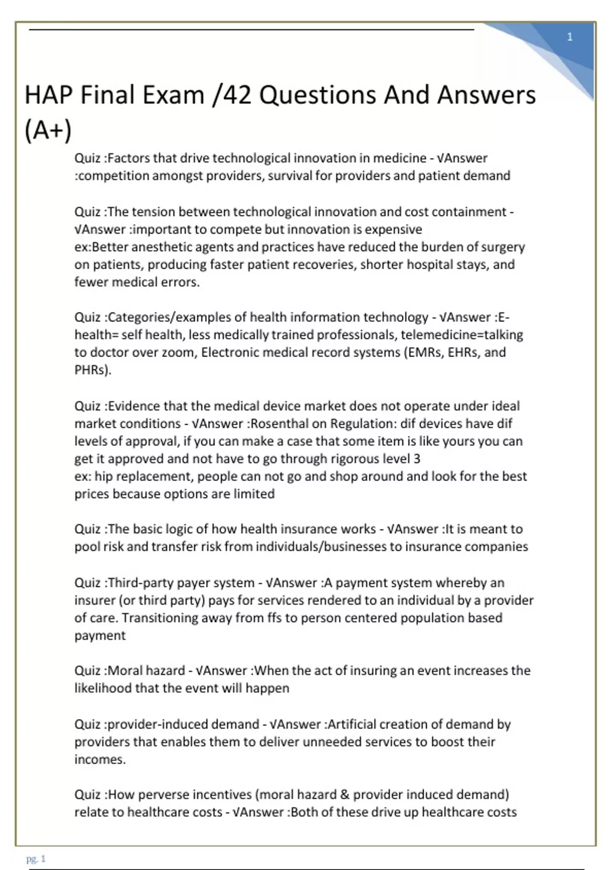 Exam (elaborations) HAP Final Exam /42 Questions And Answers (A+) 2 Exam (elaborations) HAP 1 Final Practice Exam /61 Questions And Answers 3 Exam (elaborations) HAP FINAL EXAM STUDY QUESTIONS WITH 100% CORRECT ANSWERS GRADED A+