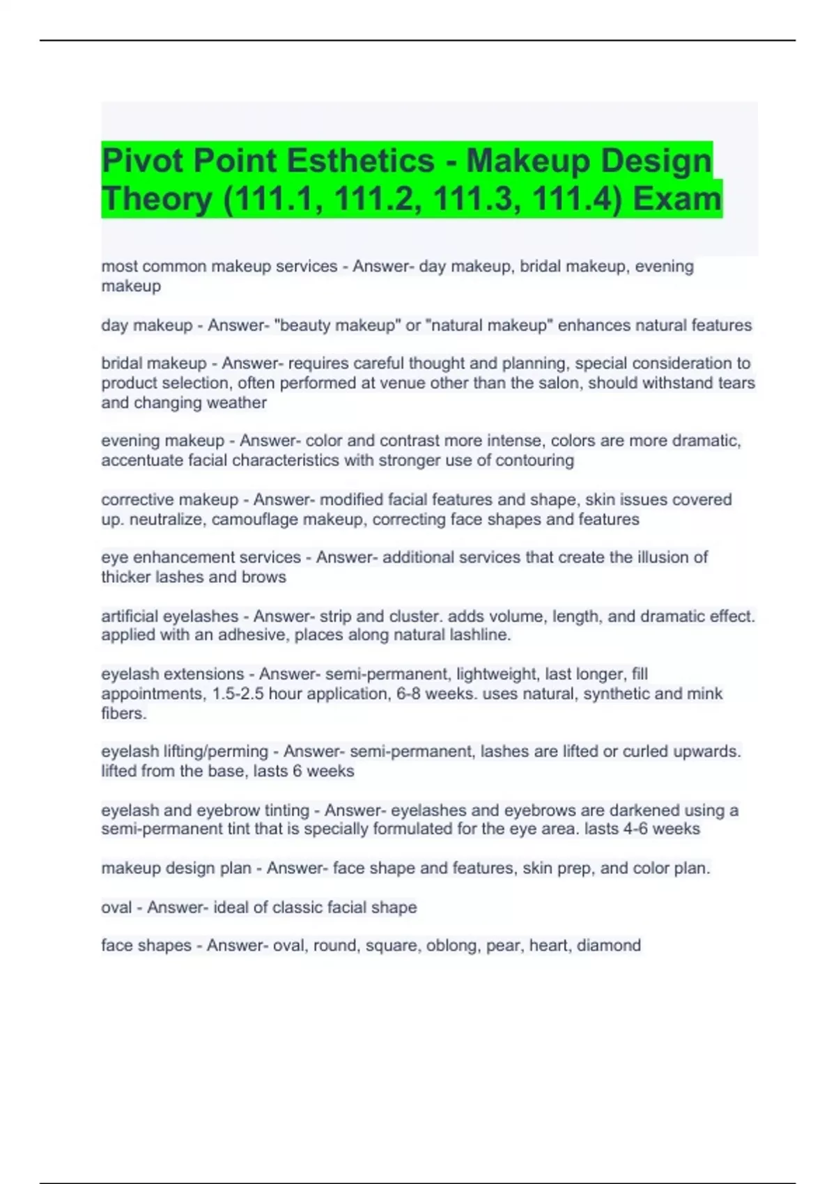 1 Exam (elaborations) Pivot Point Esthetics - Makeup Design Theory (111.1, 111.2, 111.3, 111.4) Exam 2 Exam (elaborations) Milady Esthetics Makeup part 1 Exam Questions and Answers 3 Exam (elaborations) Milady Esthetics Fundamentals Ch 12 Makeup Essentials Exam Questions and Answers 4 Exam (elaborations) Milady Esthetics Chapter 20 – Makeup Exam