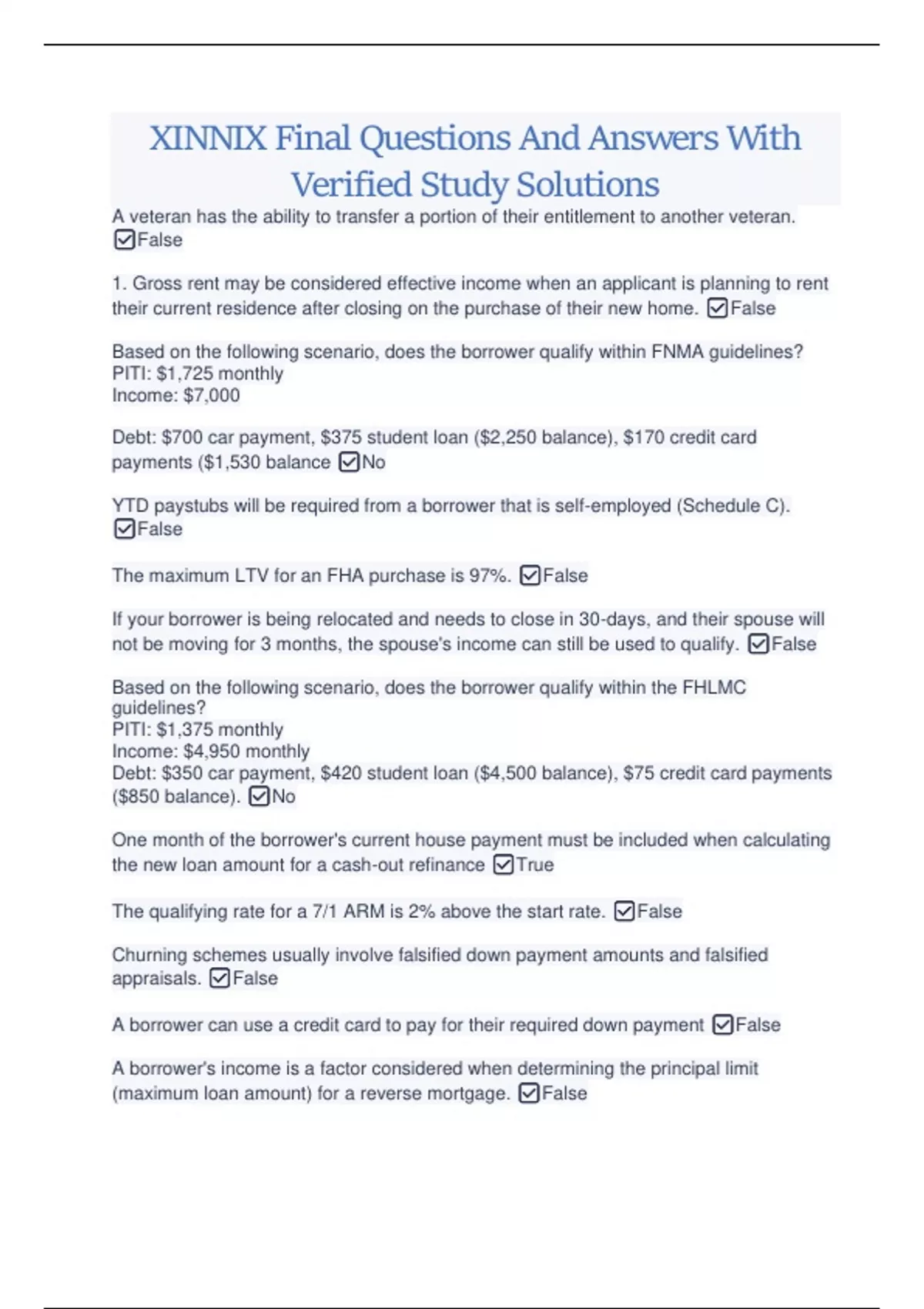 XINNIX Verified Package Deal With Complete Study Solutions 2023/2024 Updates XINNIX Mortgage Basix Verified Questions And Answers With Complete Tests XINNIX SOAR Mock Exam Complete Questions And Answers 2023/2024 XINNIX Ground School Mortgage Final Exam | Complete Questions And Answers XINNIX Mock Exam Review With Questions And Answers 2023/2024