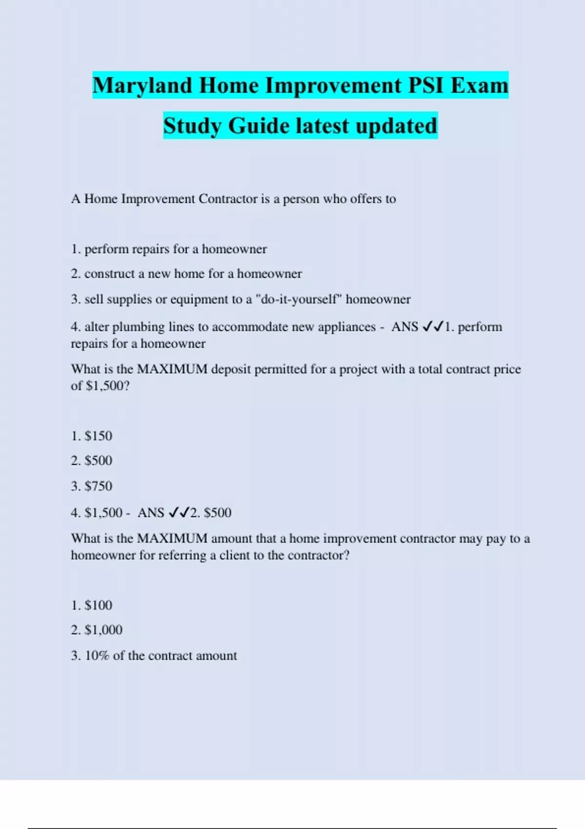 MARYLAND HOME IMPROVEMENT SALESPERSON EXAM PREP QUESTIONS AND ANSWERS