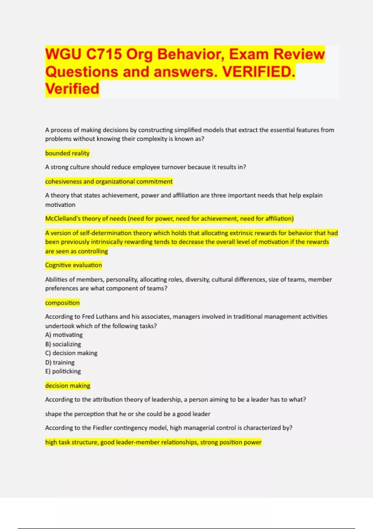 WGU C715 Org Behavior, Exam Review Questions and answers. VERIFIED. Verified