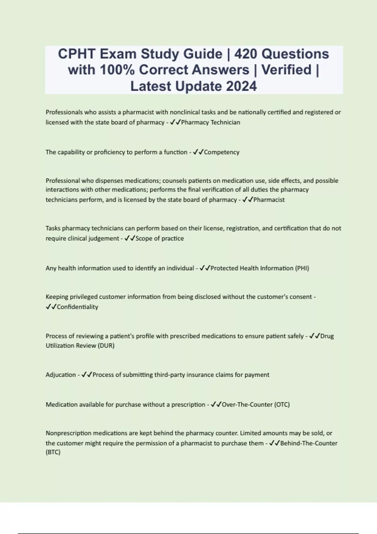 CPHT Exam Study Guide | 420 Questions with 100% Correct Answers | Verified | Latest Update 2024 | 75 Pages