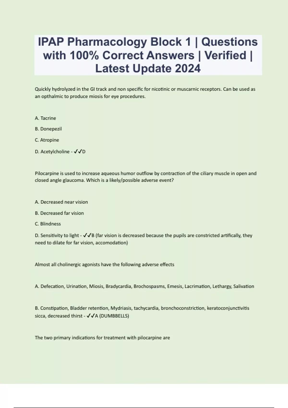 IPAP Pharmacology Block 1 | Questions with 100% Correct Answers | Verified | Latest Update 2024 | 20 Pages