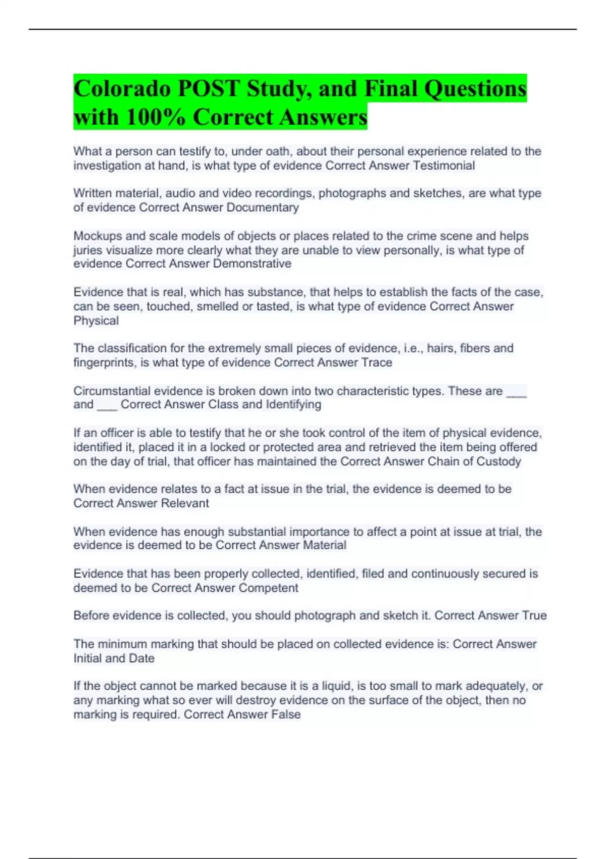 Bundled package Colorado POST Study, and Final Questions with 100% Correct Answers