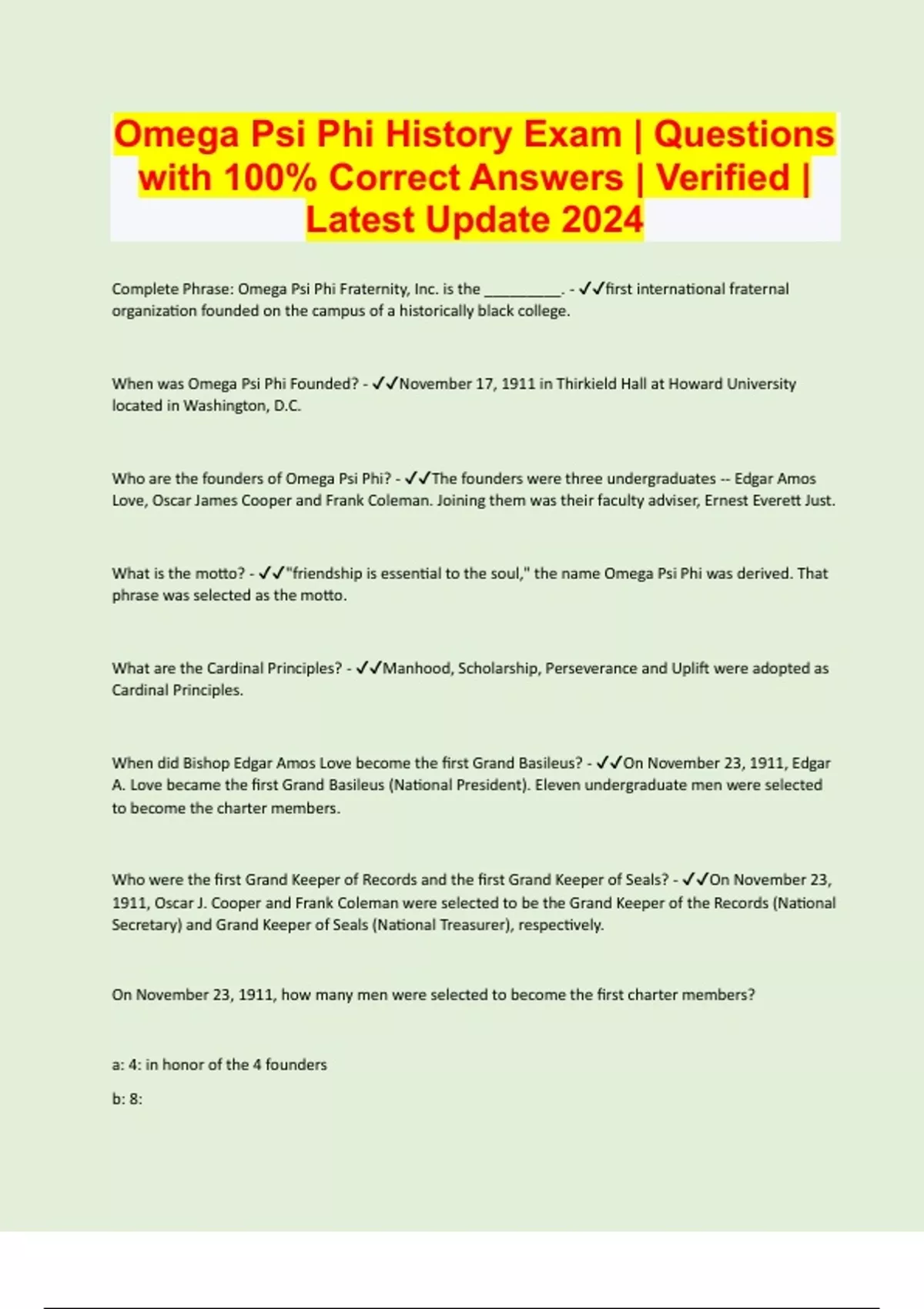 Omega Psi Phi History Exam | Questions with 100% Correct Answers | Verified | Latest Update 2024 | 25 Pages