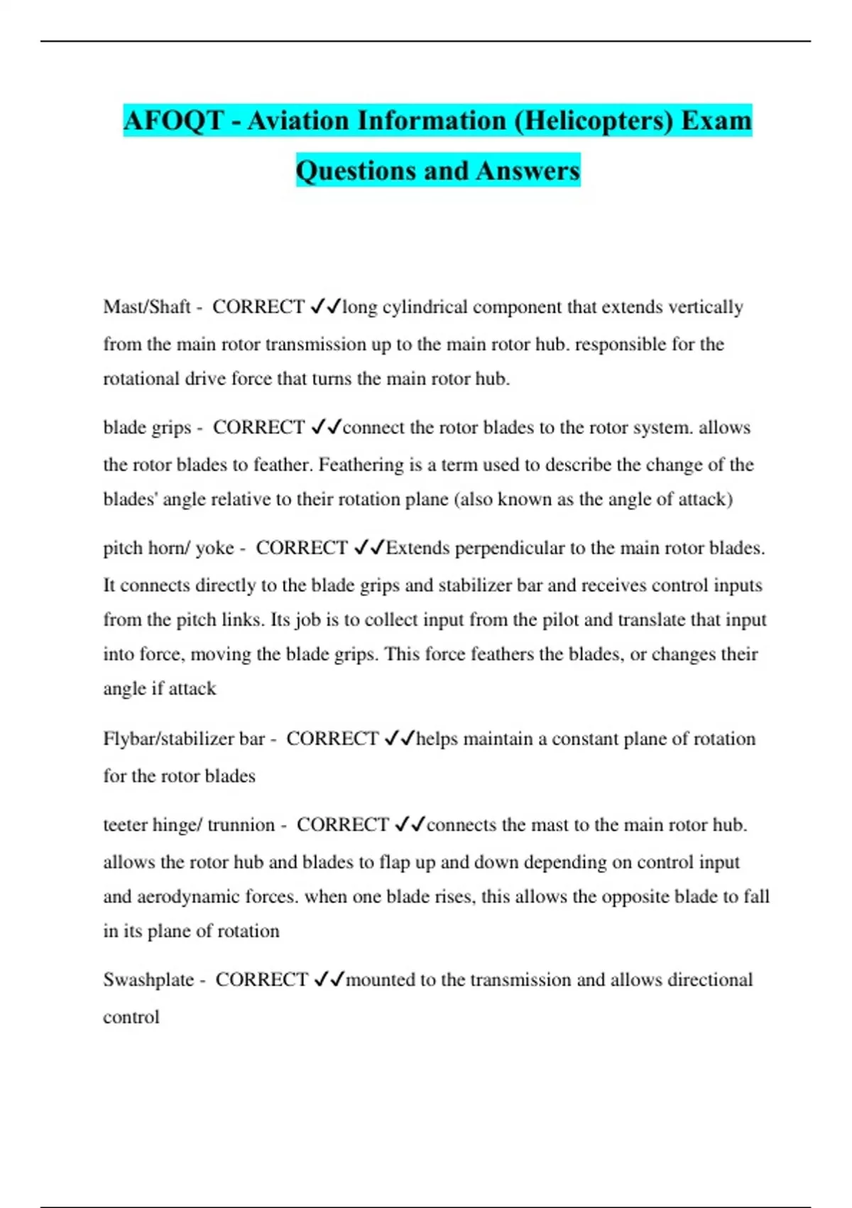 AFOQT - Aviation Information (Helicopters) Exam Questions and Answers