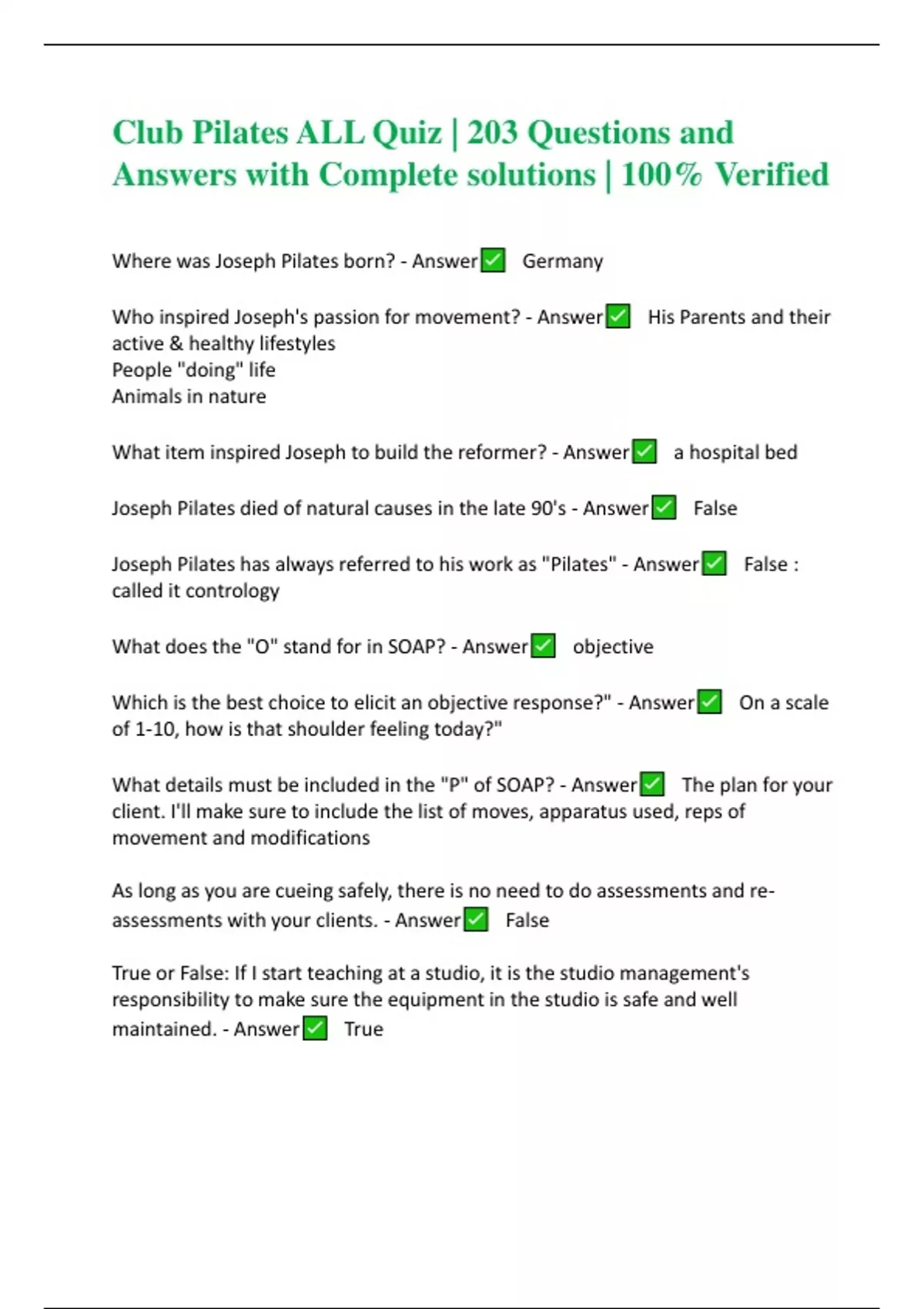 Club Pilates ALL Quiz 203 Questions and Answers with Complete solutions 100% Verified.
