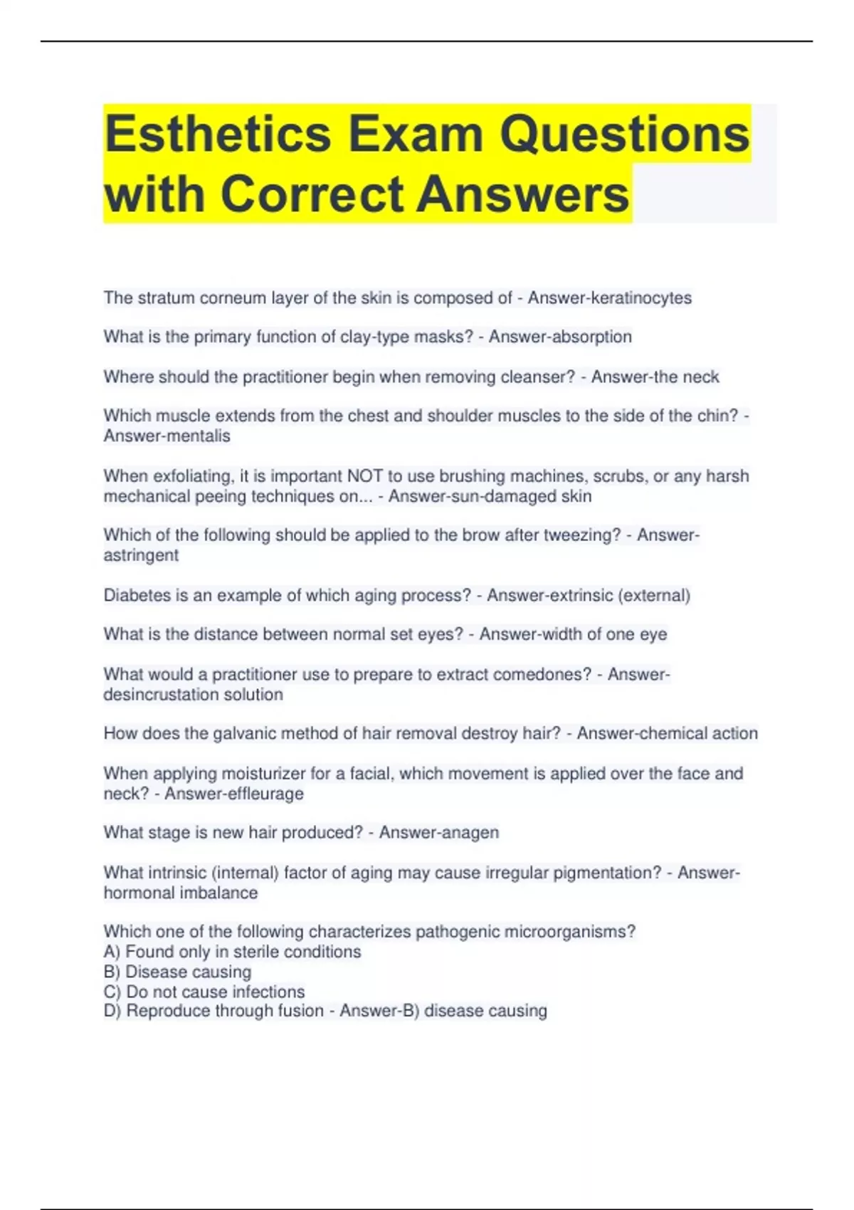 Esthetics Chapter 16 Exam Questions with Correct Answers 2 Exam (elaborations) Esthetics Exam Questions with All Correct Answers 3 Exam (elaborations) Esthetics Milady Chapter 1 Test Questions with Correct Answers 4 Exam (elaborations) Esthetics 2023 Exam Questions and Answers 5 Exam (elaborations) Milady Esthetics Final Exam Questions and Answ