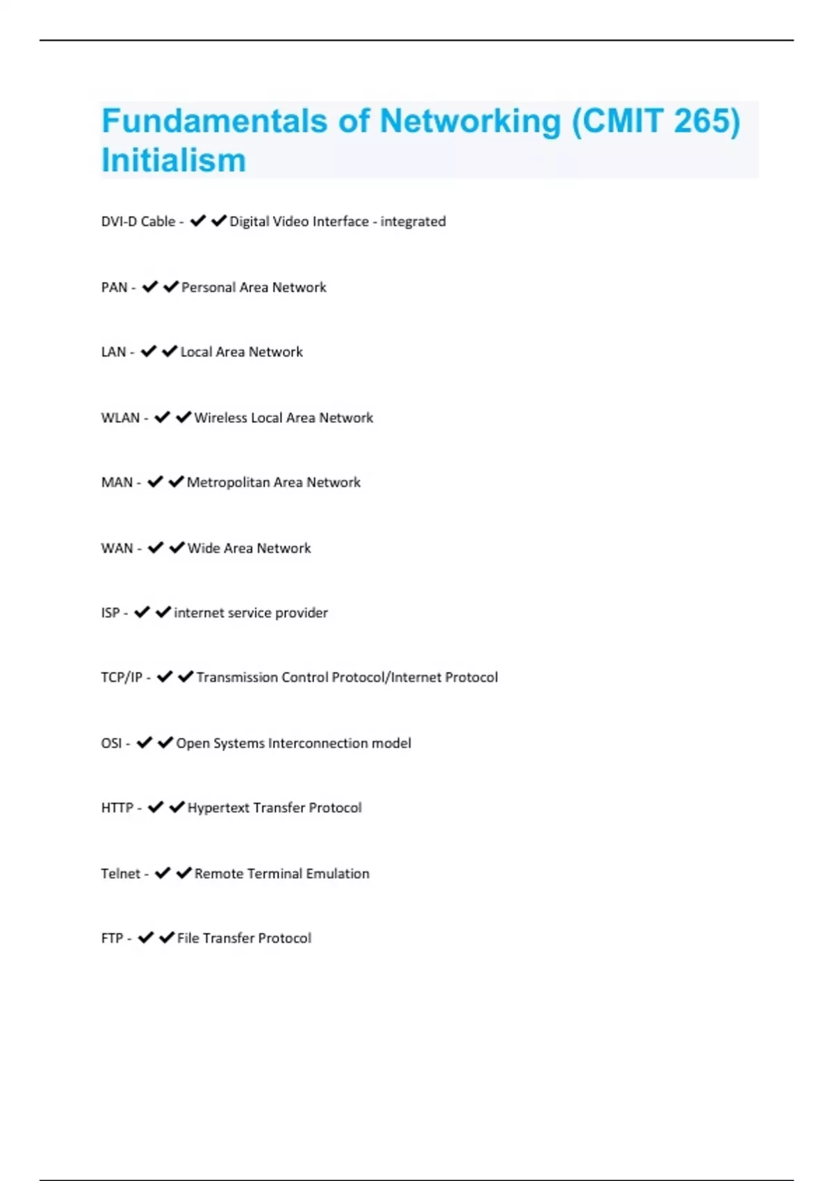 Fundamentals of Networking (CMIT 265) Initialism Questions With Correct Answers Already Passed!!