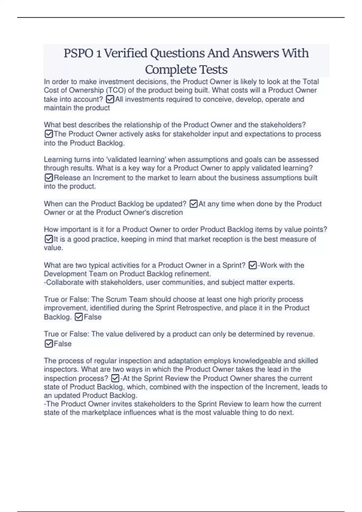 Professional Scrum Product Owner (PSPO I & PSPO II) Verified Package Deal With Complete Study (Questions And Answers)