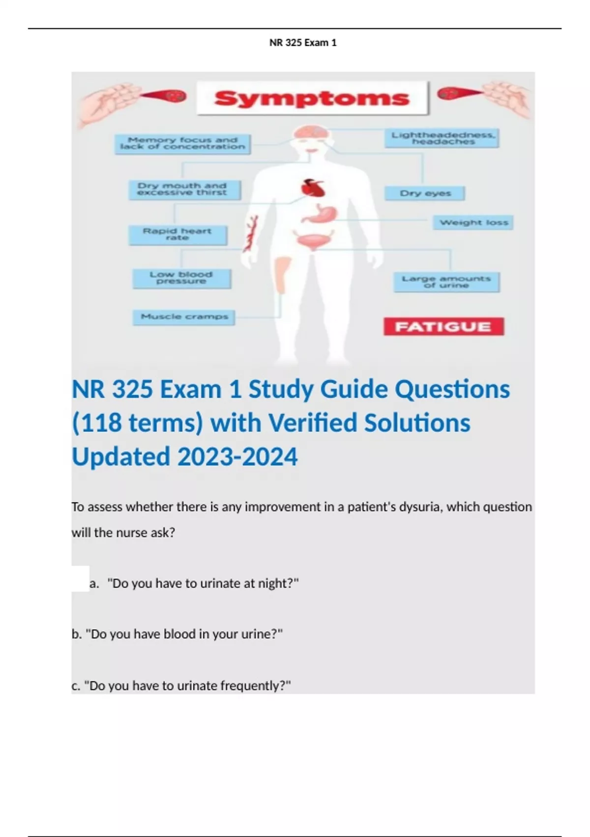 1 Exam (elaborations) NR 325 – FINAL COMPLETE EXAM STUDY GUIDE QUESTIONS (282 TERMS) WITH CORRECT SOLUTIONS WITH RATIONALES UPDATE . 2 Exam (elaborations) Adult Health NR-325 Exam 1 Study Guide Questions with Definitive Solutions, Already Graded A+ 2024. 3 Exam (elaborations) NR 325 EXAM 1 CHAMBERLAIN SET OF 60 QUESTIONS WITH CERTIFIED S