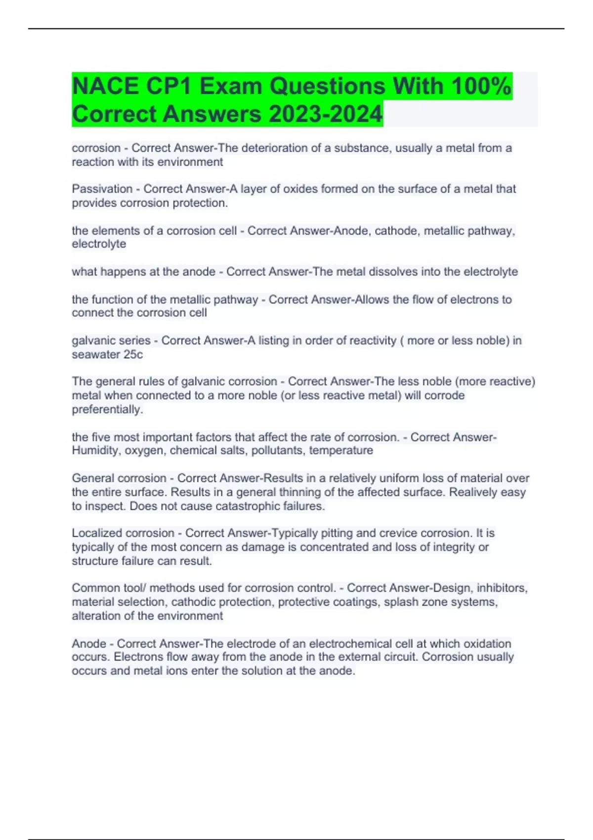 NACE CP1 Exam Questions With 100% Correct Answers NACE CP1 Book Chapters 1-4 exam Questions with 100% Correct Answers | Verified | Updated NACE (National Association of Corrosion Engineers) CP1 Tester Exam with Complete questions and Answers Graded A+ NACE CP1 Book Chapters 5-10 with Complete questions and Answers Graded A+ NACE