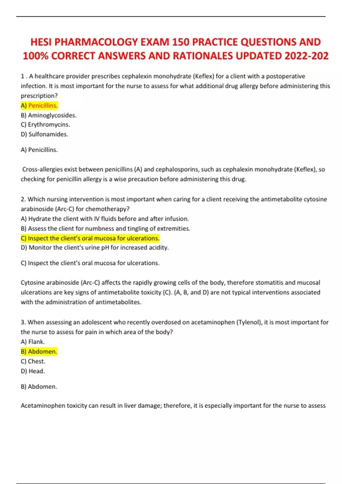 HESI PHARMACOLOGY EXAM 150 PRACTICE QUESTIONS AND 100% CORRECT ANSWERS AND RATIONALES UPDATED 2022-202