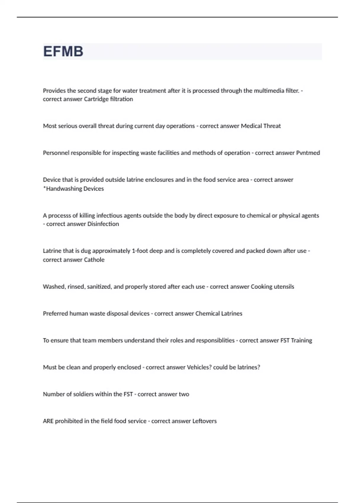 2023 EFMB Written Test Question Bank Flashcards - SSG Summerlin Question and answers correctly solved 2023/2024 Exam (elaborations) Army EFMB Question and answers 2023/2024 verified to pass Exam (elaborations) EFMB 1 Question and answers already passed 2023/2024 Exam (elaborations) EFMB 2 Question and answers already passed 2023/2024 Exam (