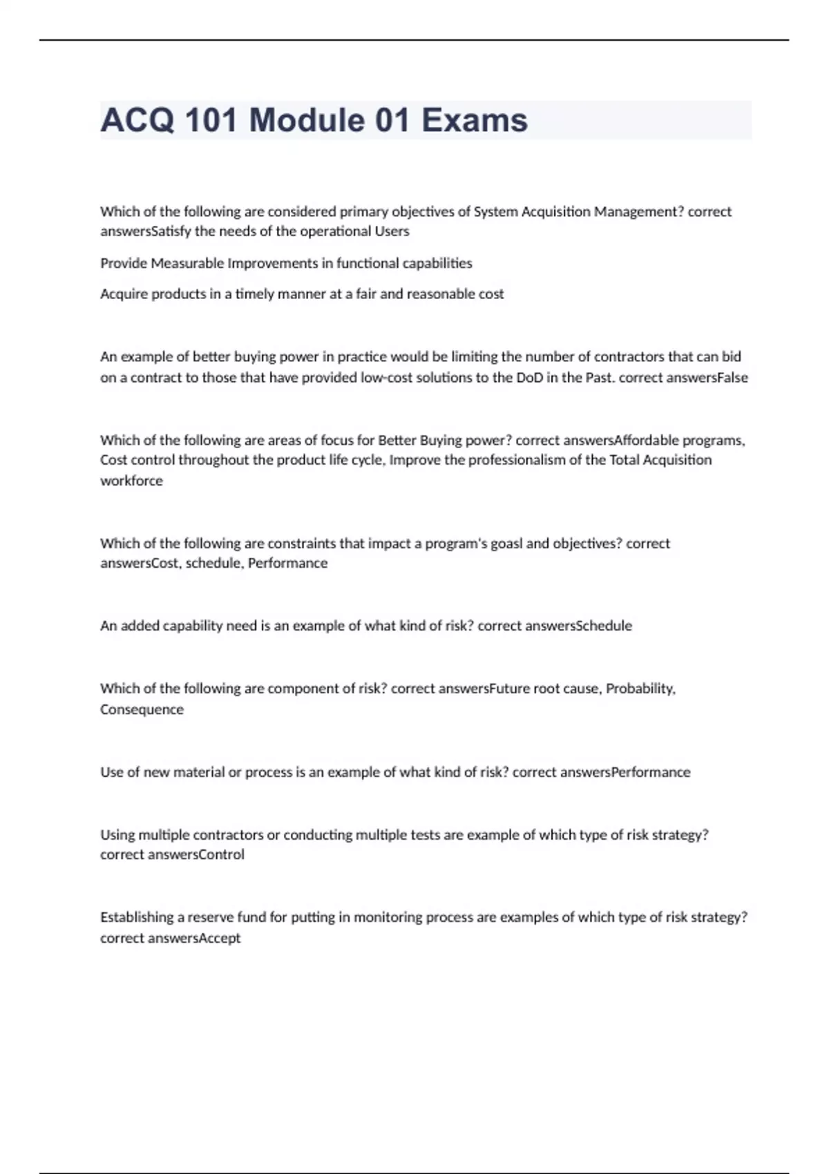 ACQ 101 Module 01 Exams 2023/2024 with 100% correct answers ACQ 101 Module 08 & Exam: Contract Management with 100% correct answers