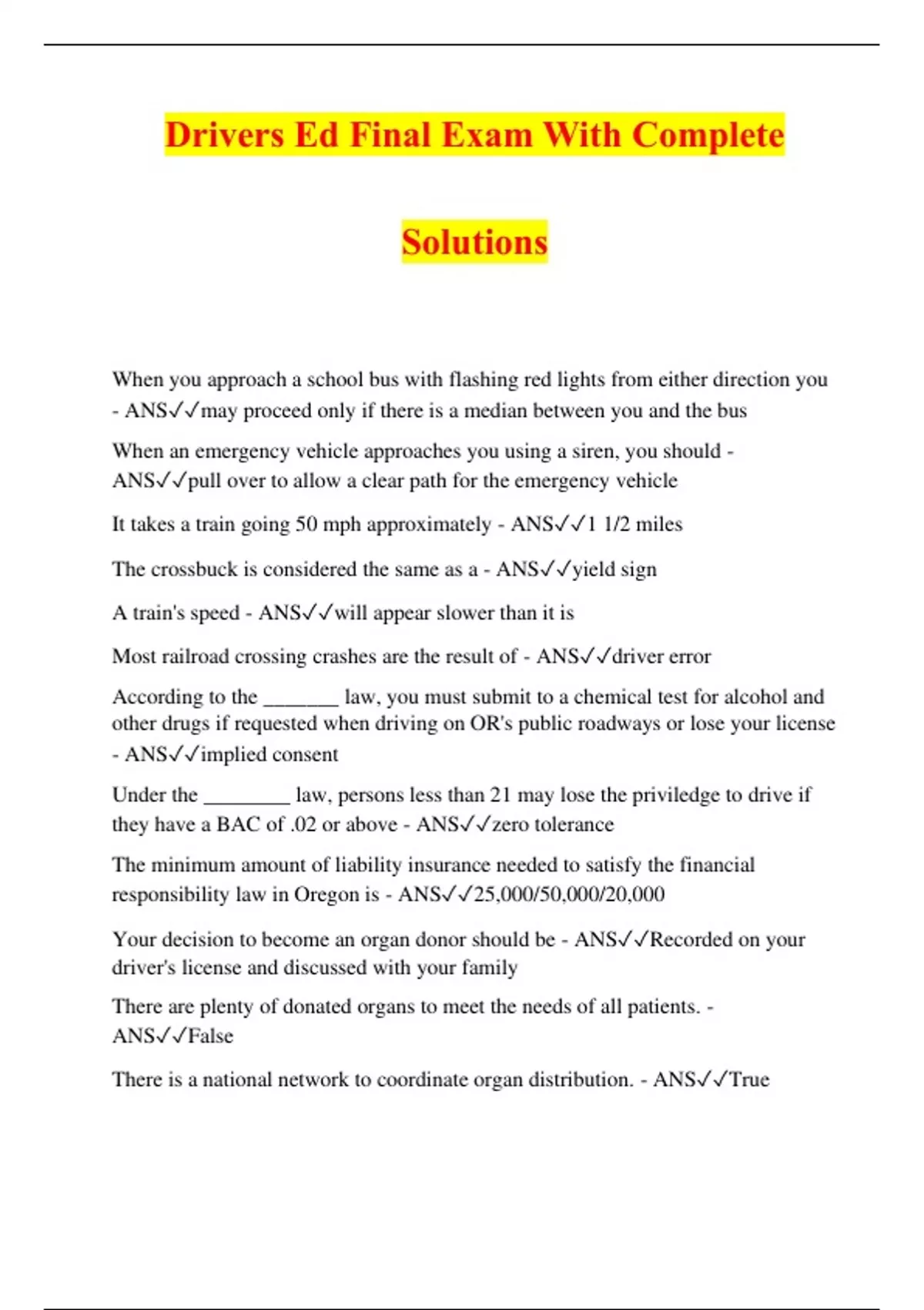DRIVERS ED EXAM PACK WITH COMPLETE SOLUTION GRADED A+