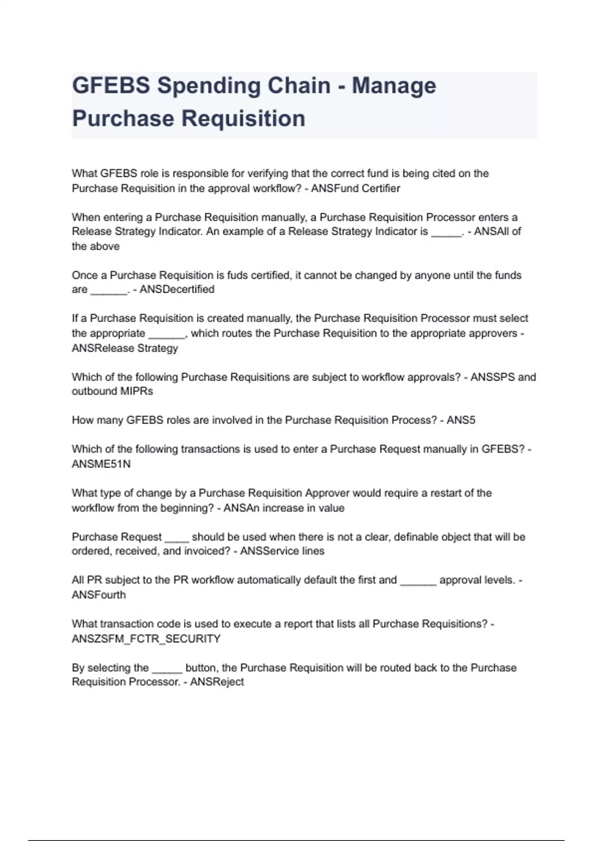 GFEBS Spending Chain - Manage Purchase Requisition Questions and Answers 2023/2024 already graded A ( COMPLETE BUNDLE)