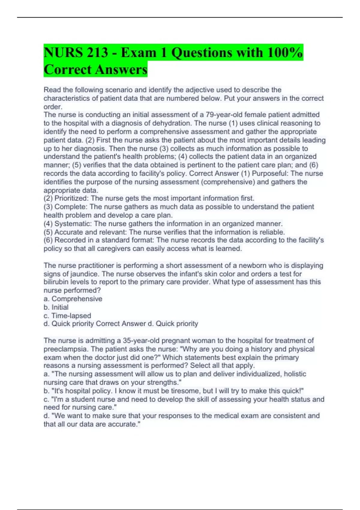 NUR 213 Bundled Package Practice Questions with 100% Correct Answers