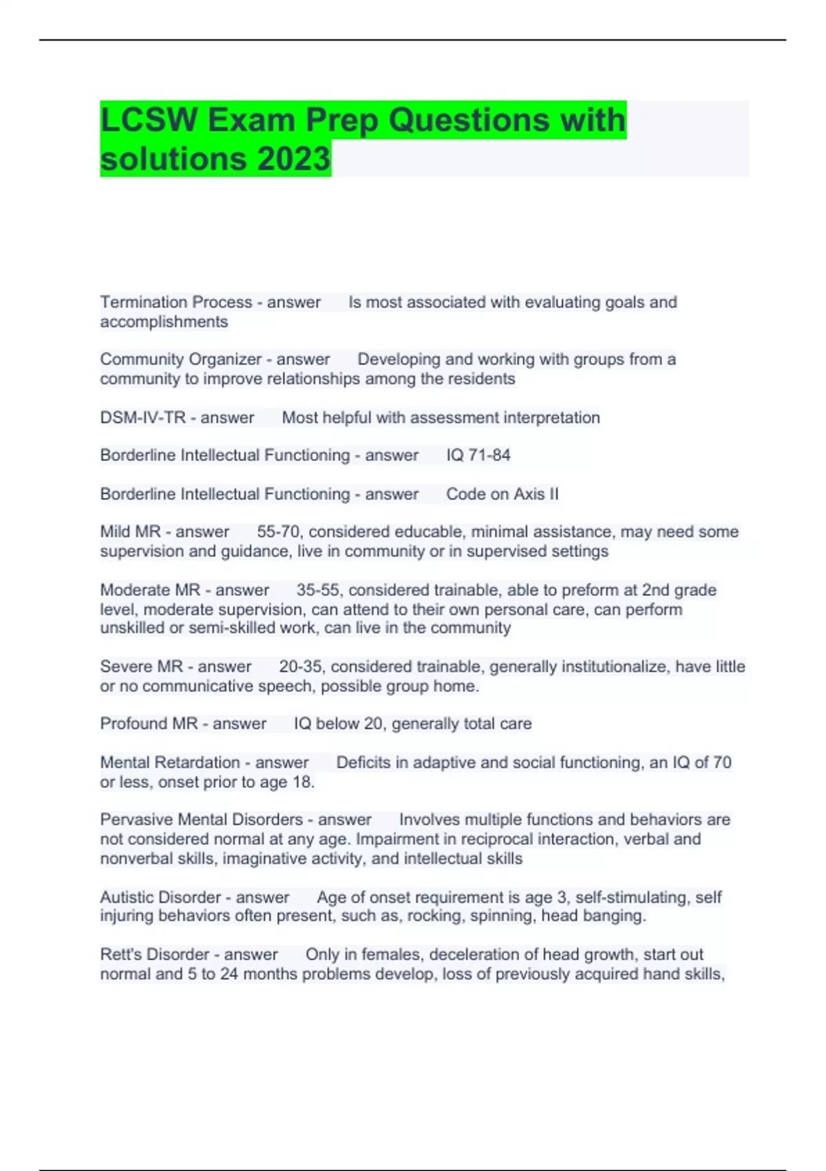 Exam (elaborations) LCSW Exam Questions and Answers Rated A+ Exam (elaborations) LCSW exam Questions Answered 100% correct 2023 Exam (elaborations) LCSW Exam Prep Questions and Answers Fully solved Exam (elaborations) ASWB LCSW QUESTIONS AND ANSWERS LATEST UPDATED 2023 Exam (elaborations) LCSW Exam Prep: Practice Evaluation/Research Questi