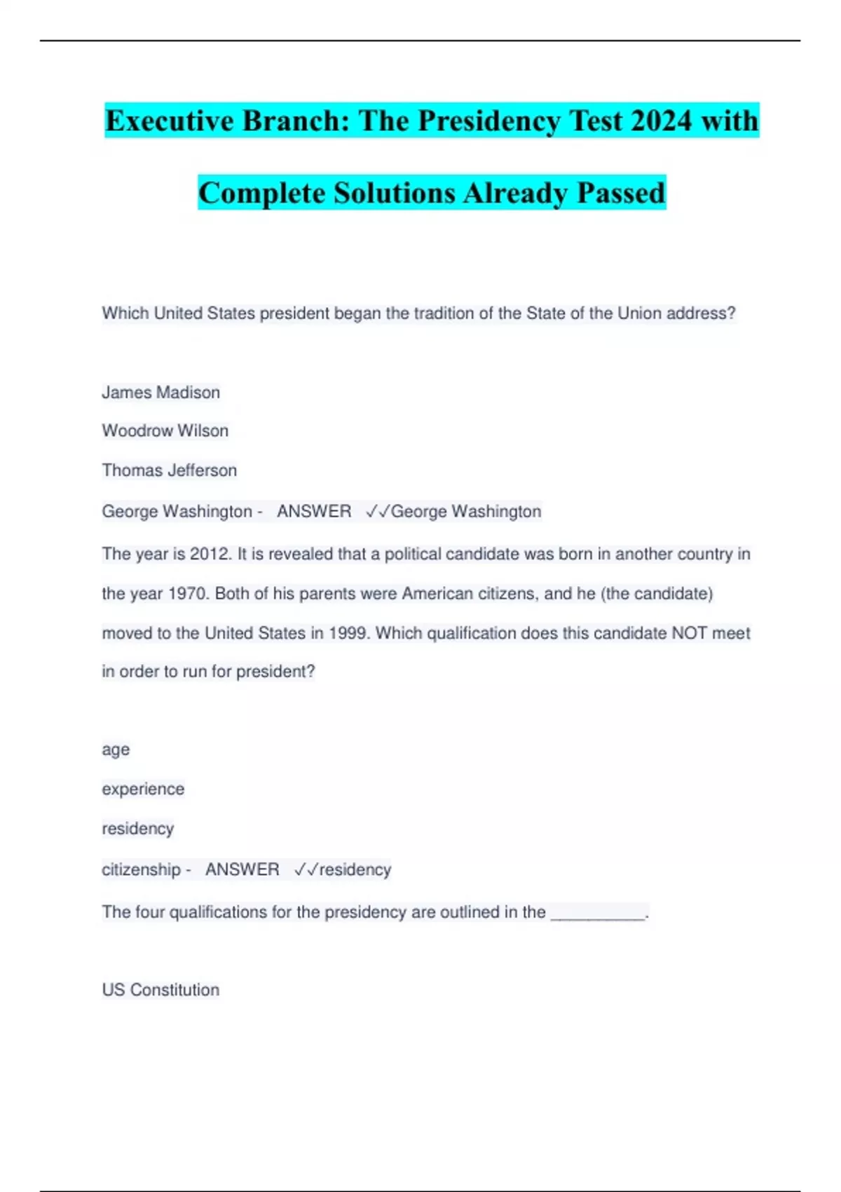 Executive Branch: The Presidency Test 2024 with Complete Solutions Already Passed