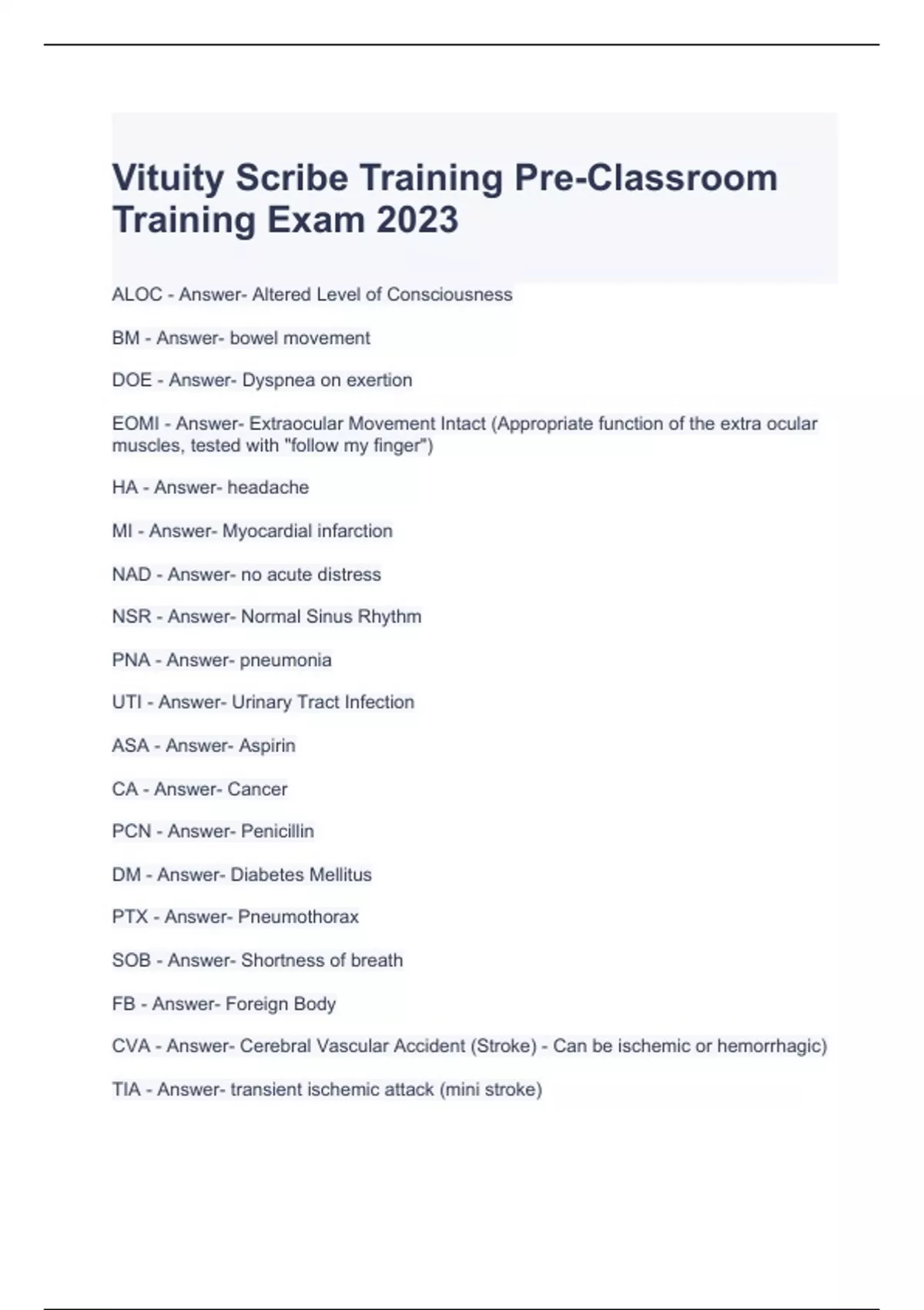 1 Exam (elaborations) Vituity Scribe Training Pre-Classroom Training Exam 2023 2 Exam (elaborations) Vituity Scribe Pre classroom Exam Questions and Answers 3 Exam (elaborations) Vituity Scribe Policy Exam with correct Answers 4 Exam (elaborations) Vituity Scribe General Medical Terminology Questions and Answers 5 Exam (elaborations) Vituity Sc